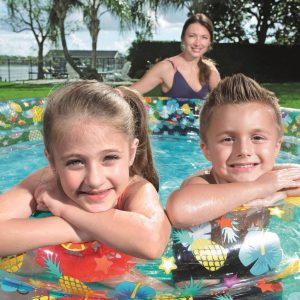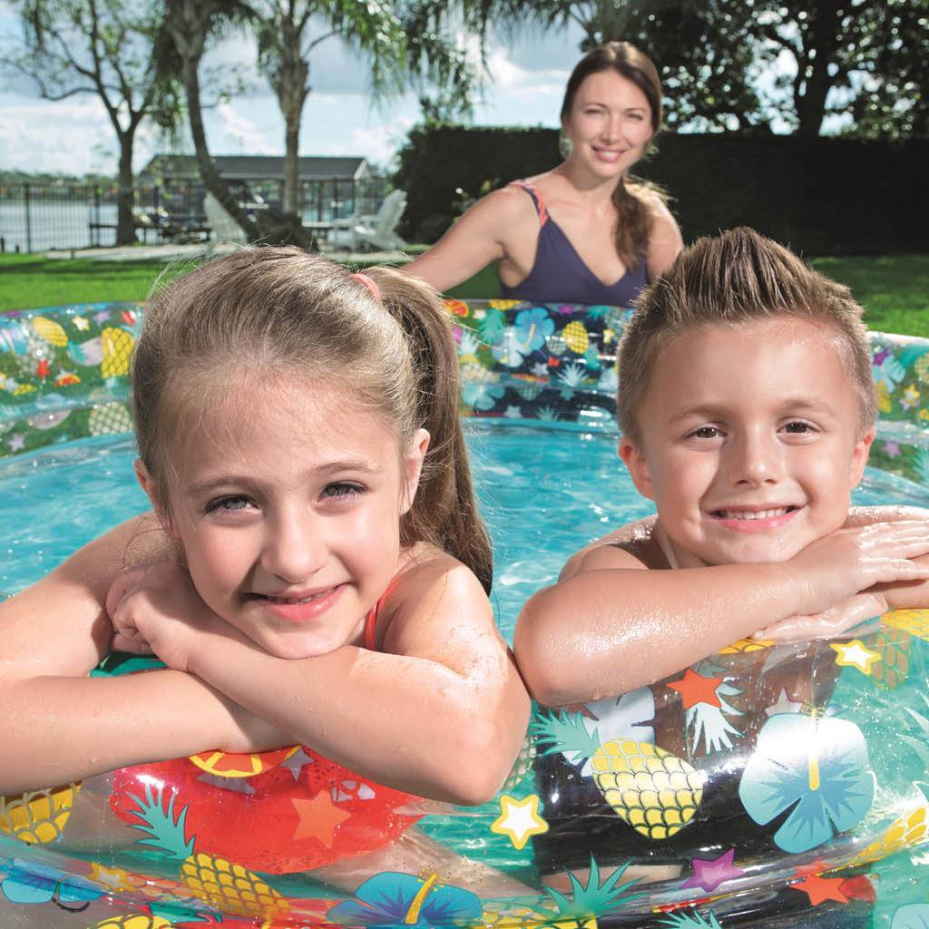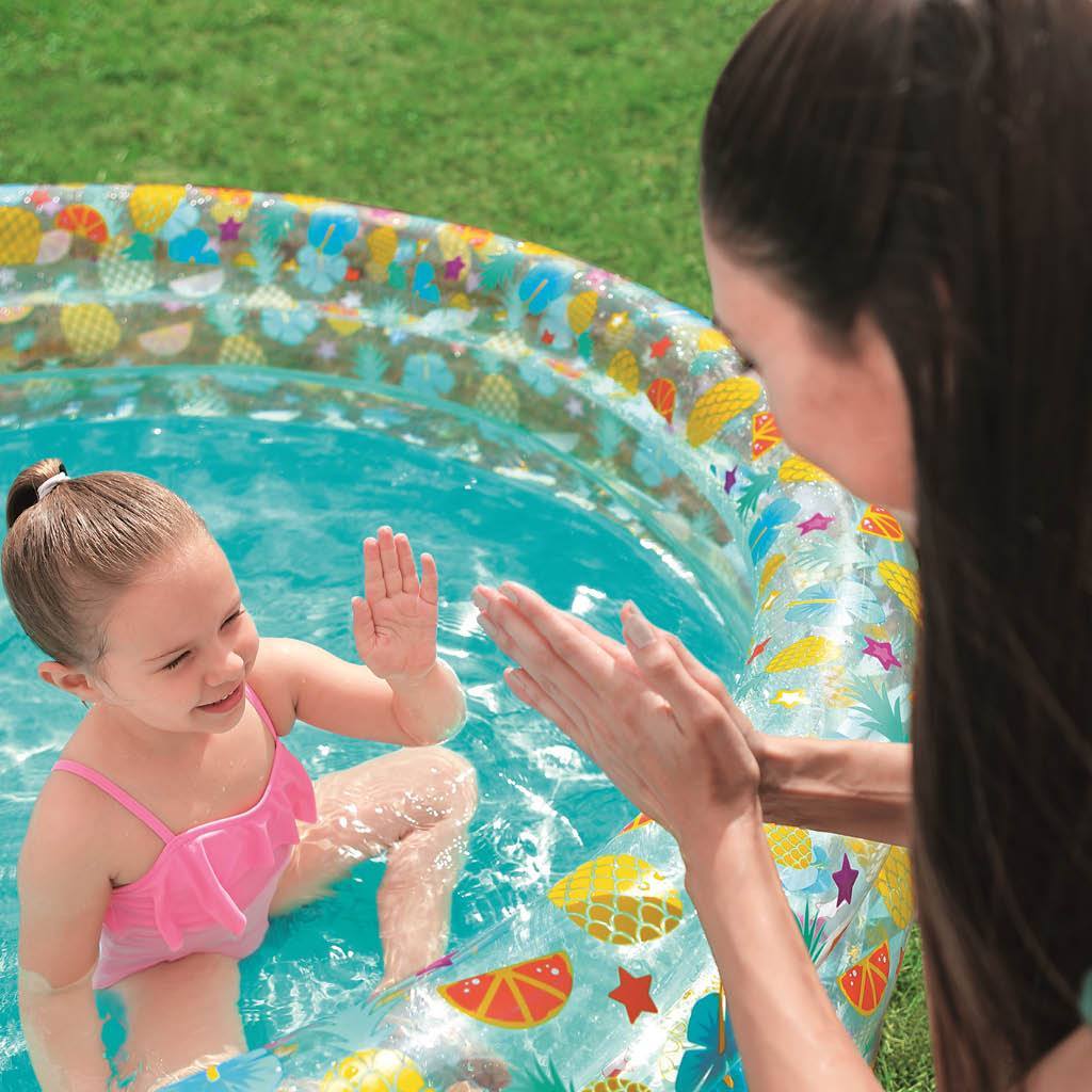 Hauskoilla hedelmillä kuvioidussa raikkaan näköisessä uima-altaassa on kolme rengasta.