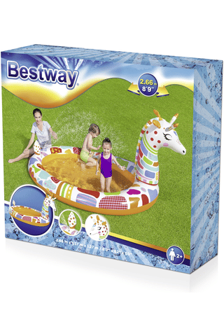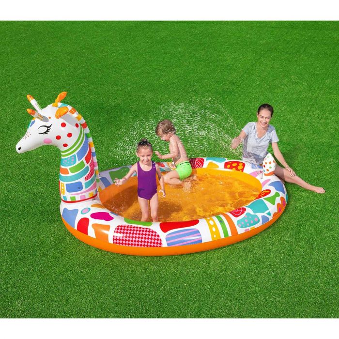 - Värikäs kirahvin näköinen uima-allas, joka suihkuttaa vettä uijien päälle, jos altaan yhdistää puutarhaletkuun.
