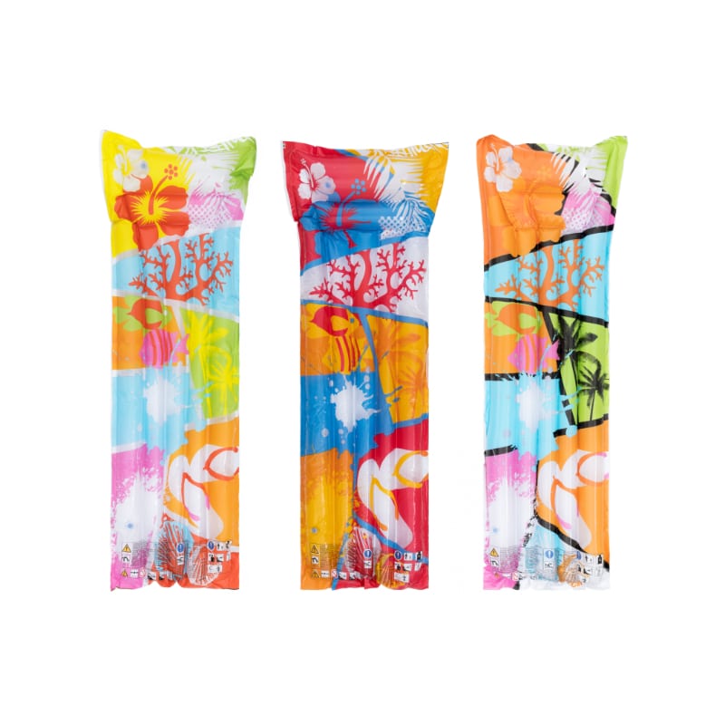 Mikä olisikaan mukavampaa kuin loikolla uimapatjan päällä vedessä lämpimänä kesä päivänä? Lajitelmassa kolme eri värikästä uimapatja kuosia. Materiaali on kestävää vinyyliä. Uimapajassa on kaksikammioinen tyynyrakenne ja turvaventtiili. Mukana tulee korjauspaikka. Maksimikantavuus on 90 kg. Ikäsuositus: 14+ vuotta.