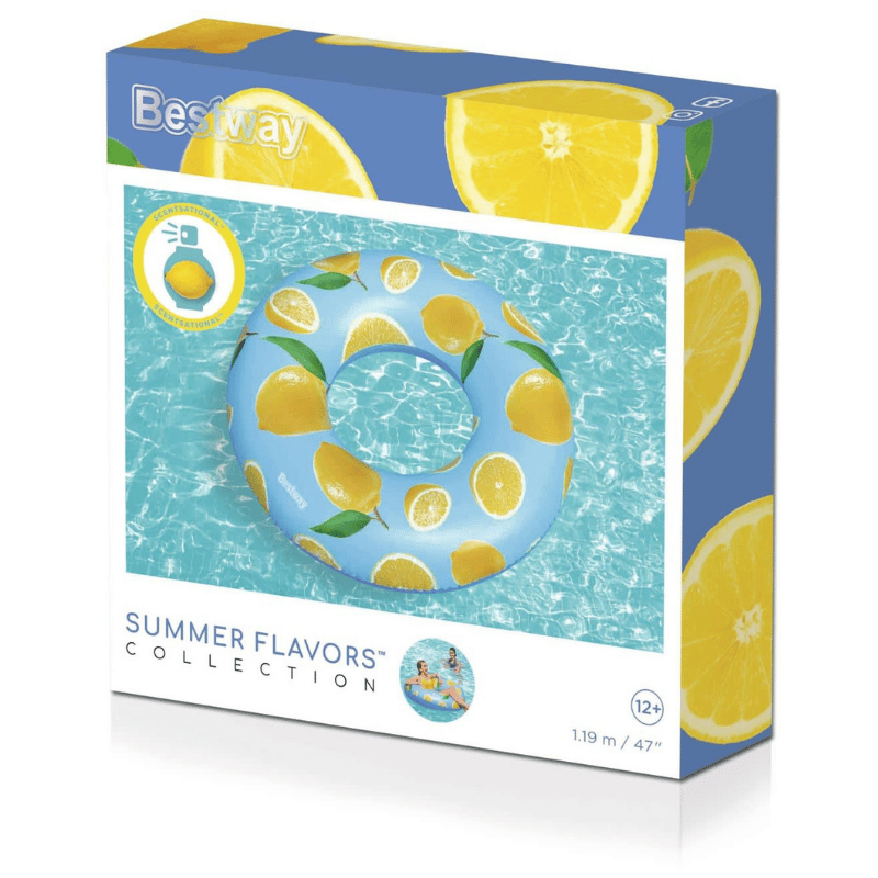 Raikkaan sitruunan tuoksuinen uimarengas viihdyttää lämpöisenä kesäpäivänä. Herkullisen näköisen uimarenkaan halkaisija on 119 cm.
