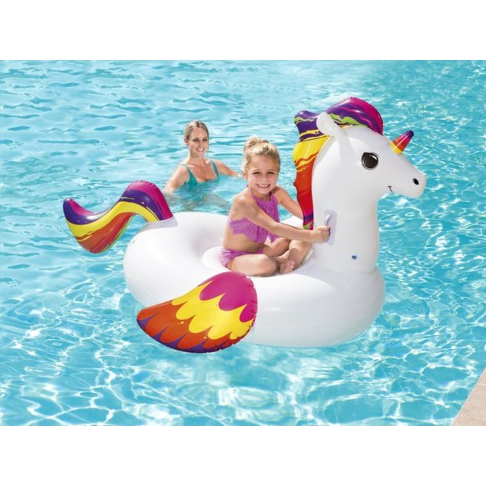 Söpö yksisarvisuimalautta kesän kuumimpiin päiviin uima-altaalla. Yksisarvisen kaulassa on järeät kahvat, joten sen päällä on helppo pysyä. Sisältää korjauspaikan. Yhdelle lapselle, maks. kuormitus 45 kg. Koko 150 x 117 cm. Ikäsuositus 3+.