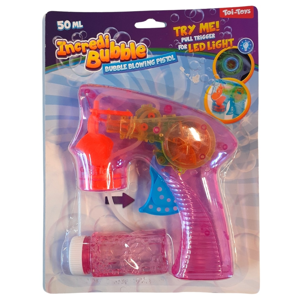 Valaiseva kuplapistooli ja 50 ml kupla-ainetta. Sopii 3-vuotiaille ja sitä vanhemmille.