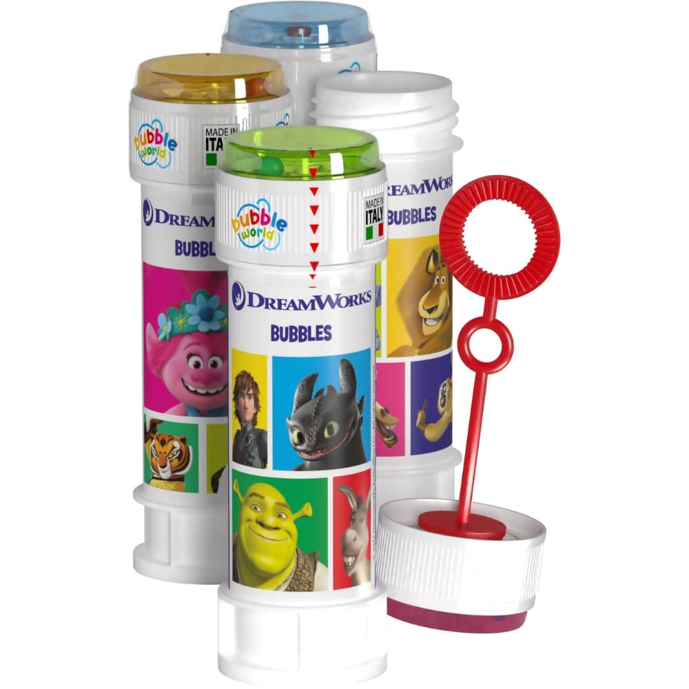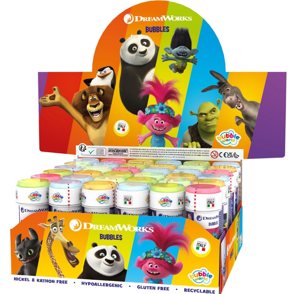Mikä onkaan hauskempaa kuin puhaltaa saippuakuplia? Kuplisnestepullossa on Dreamworksin elokuvista tuttuja hahmoja. Pullon valmistuksessa on käytetty vähintään 30 % kierrätettyä muovia. Ikäsuositus: yli 3-vuotiaille.