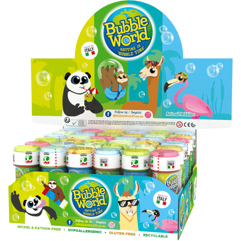 Saippuakuplanestepulloa koristavat iloiset eläinystävät.