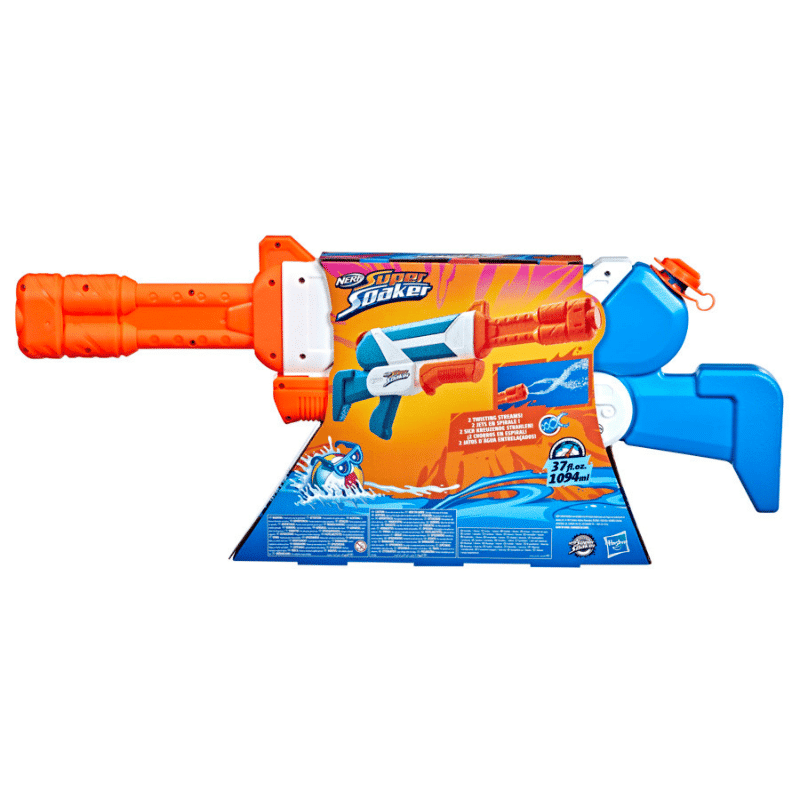 Täräytä ilmoille kaksi kierteistä vesisuihkua Nerf Super Soaker Twister vesiblasterilla. Kun pumppaat kahvaa, piipun kärjessä oleva sylinteri pyörii muodostaen kaksoiskierteen vedelle! Blasteri on helppo täyttää ja käyttää. Avaa korkki, täytä säiliö, sulje korkki ja pumppaa kahvaa taaksepäin ja eteenpäin. Pituus 67 cm ja vesisäiliön tilavuus 1094 ml. Ikäsuositus 6+.
