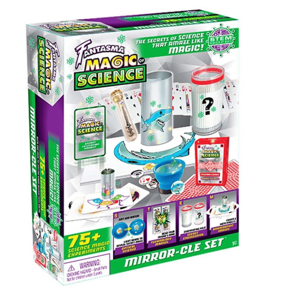 Fantasma magic Mirror-Cle-setti auttaa sinua kehittämään itseluottamustasi, esiintymistä, käsien ja silmän koordinaatiota ja ihmisten välistä kommunikaatiota. Täydellinen lahja yli 7-vuotiaille pojille ja tytöille. Fantasma-taikasetit ovat ainoita taikasettejä, jotka International Brotherhood of Magiciansin ammattilaiset ovat hyväksyneet. STEM taikasetissä on yli 75 hämmästyttävän maagista tiedekoetta.