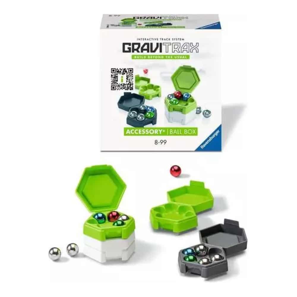 Gravitrax lisäosa Ball Box. Tämä setti sisältää lisää kuulia entistäkin hauskempaan kuularata-ajeluun ja siistit säilytysrasiat olemassa oleville GraviTrax-kuulille. Kuulien säilytysrasia on pakollinen kaikille GraviTraxin käyttäjille! Nämä neljä rasiaa on suunniteltu GraviTraxin korkeuspalikoiden siistillä muotoilulla ja väreinä vihreä, harmaa ja valkoinen. Kaksi rasioista on jo valmiiksi täytetty yhteensä 12 hopeisella ja värikkäällä GraviTrax-kuulalla, jotka saavat ratatoiminnan käyntiin. Kaksi muuta rasiaa toimivat ihanteellisena säilytysvaihtoehtona olemassa oleville kuulille.