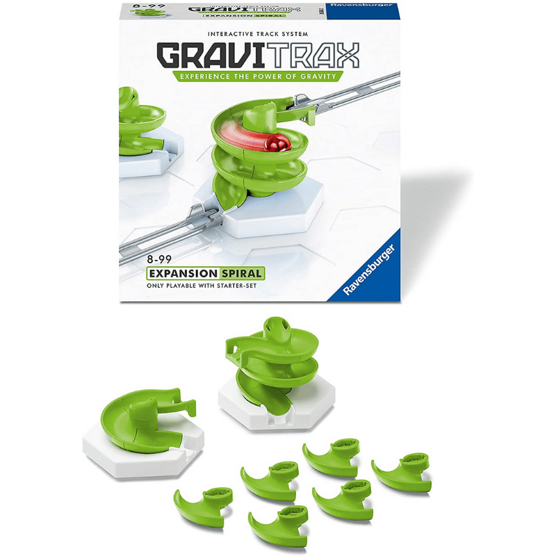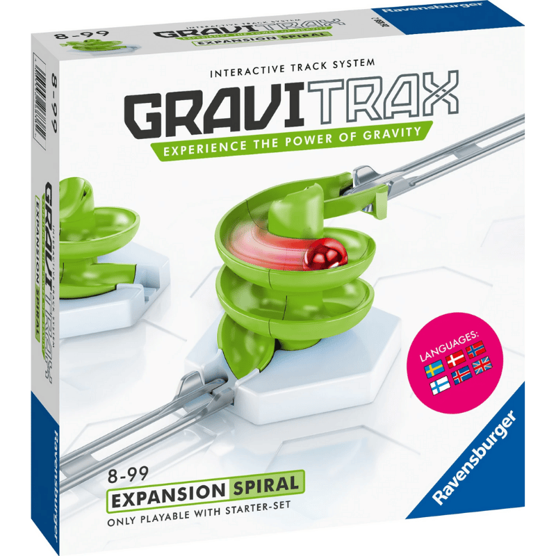 Pistä kuulat kierteeseen! Spiral-lisäosa siirtää kuulat eri korkeusmahdollisuuksilla ja huimalla kierteellä tasolta toiselle. Yhdistä Spiral-lisäosa GraviTrax-aloitussettiisi ja saat lisää toimintaa ja jännitystä. Mitä uusia mahdollisuuksia Spiral-lisäosa tuo radallesi?