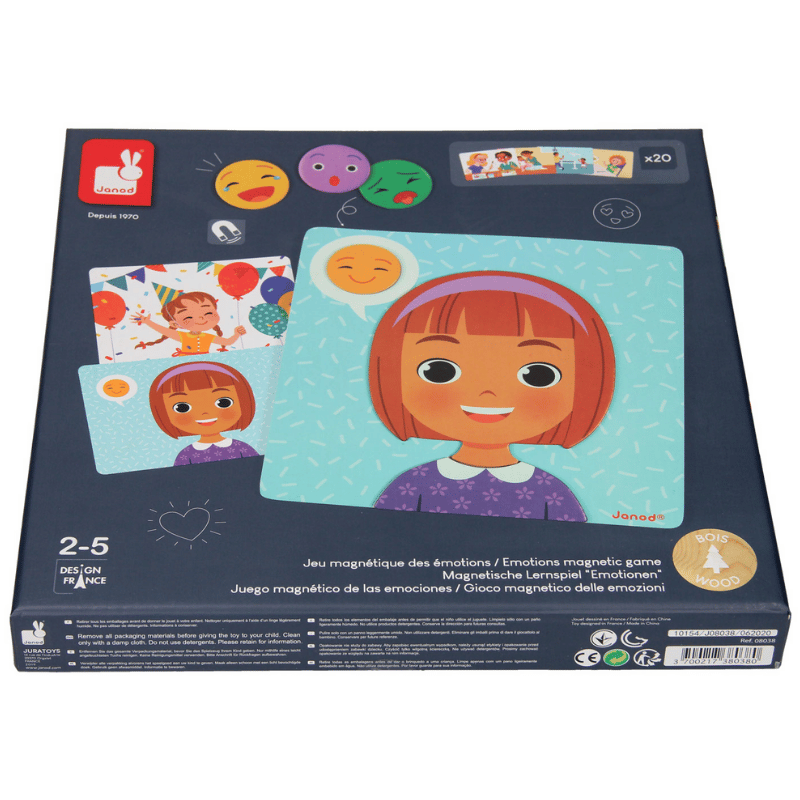 Janod Magneettinen tunnepeli sisältää pelilaudan, 27 magneettiosaa ja 20 kaksipuolista korttia. Korttien toisella puolella on kuvattu arkipäiväisiä tilanteita, joihin liittyy jokin tunne. Kortin toisella puolella on kuvattuna ilme ja tunnetta kuvaavia symboleita.
