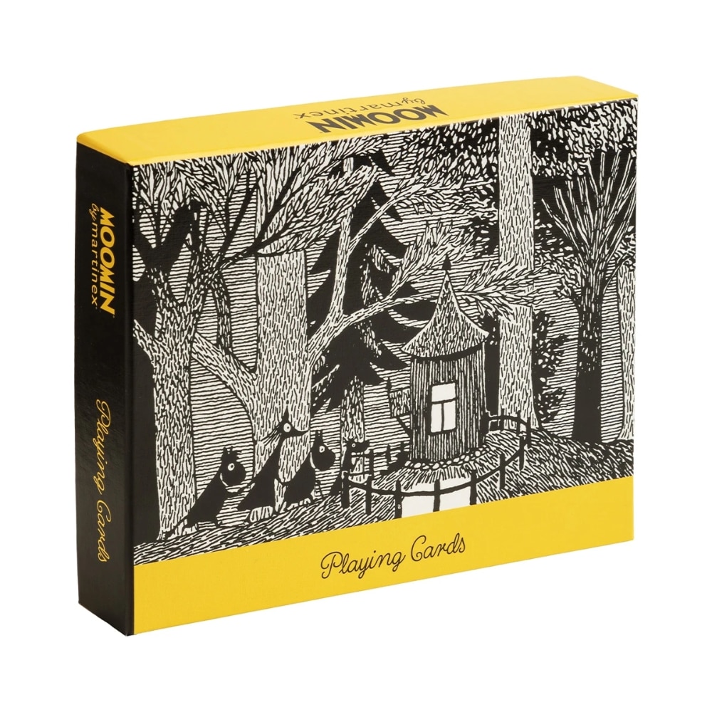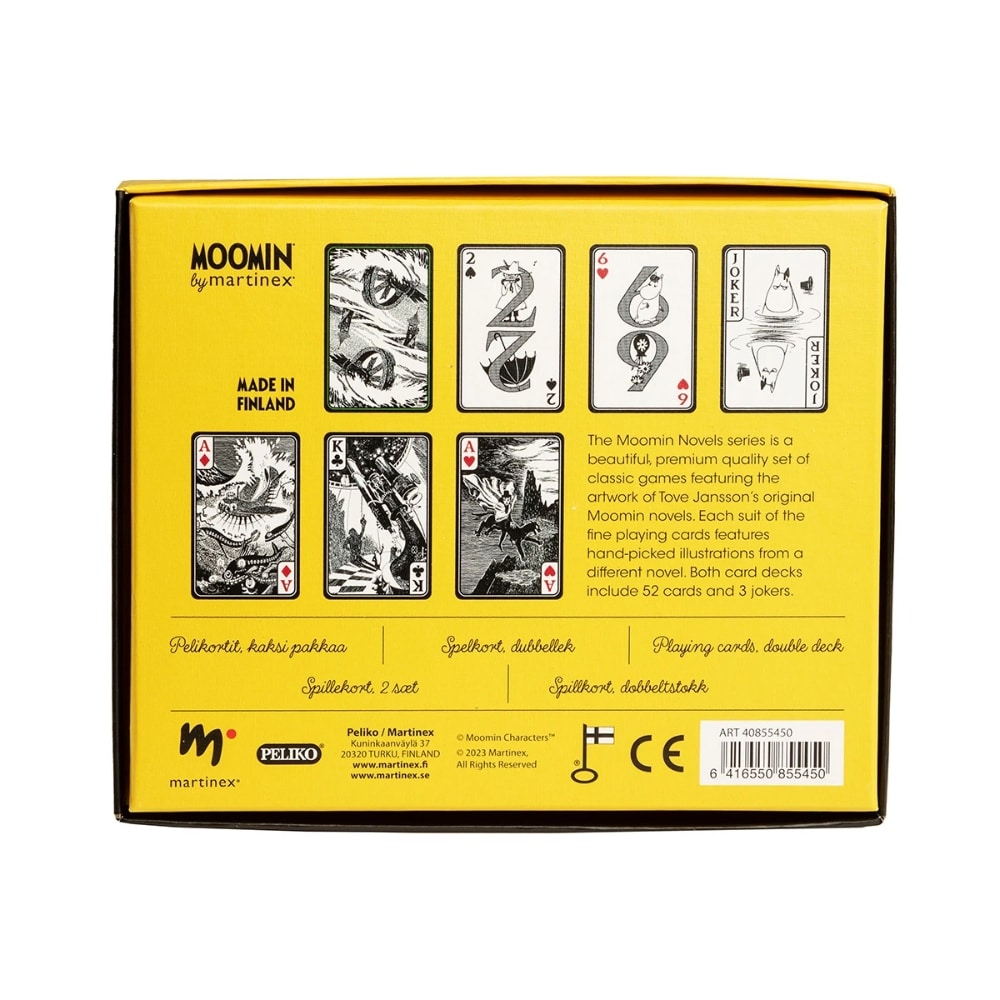 Pelikortit Muumi Novels 2 pakkaa – Muumi Novels -aiheilla kuvitetut kaksi perinteistä korttipakkaa, joissa molemmissa on 52 korttia ja 3 jokeria. Tuplakorttipakkauksen korttipakat ovat muutoin täysin samanlaiset, mutta ne voi erottaa toisistaan takapuolen reunaviivan värin avulla. Kortit on valmistettu Suomessa laadukkaasta ja kestävästä materiaalista.