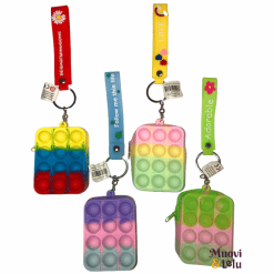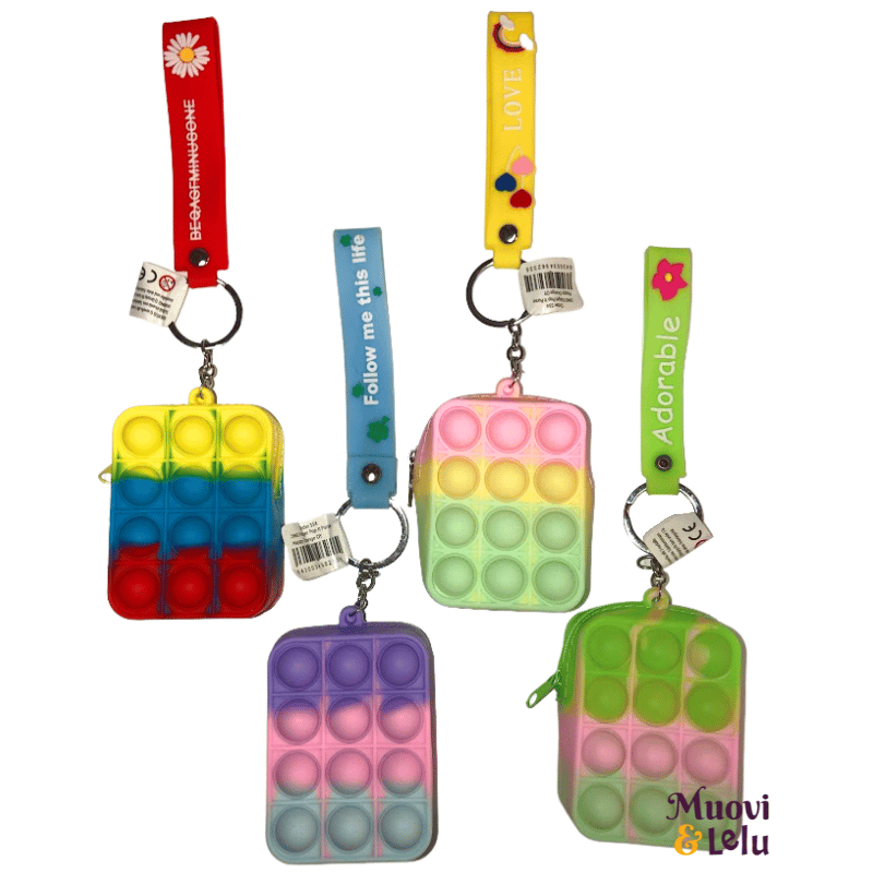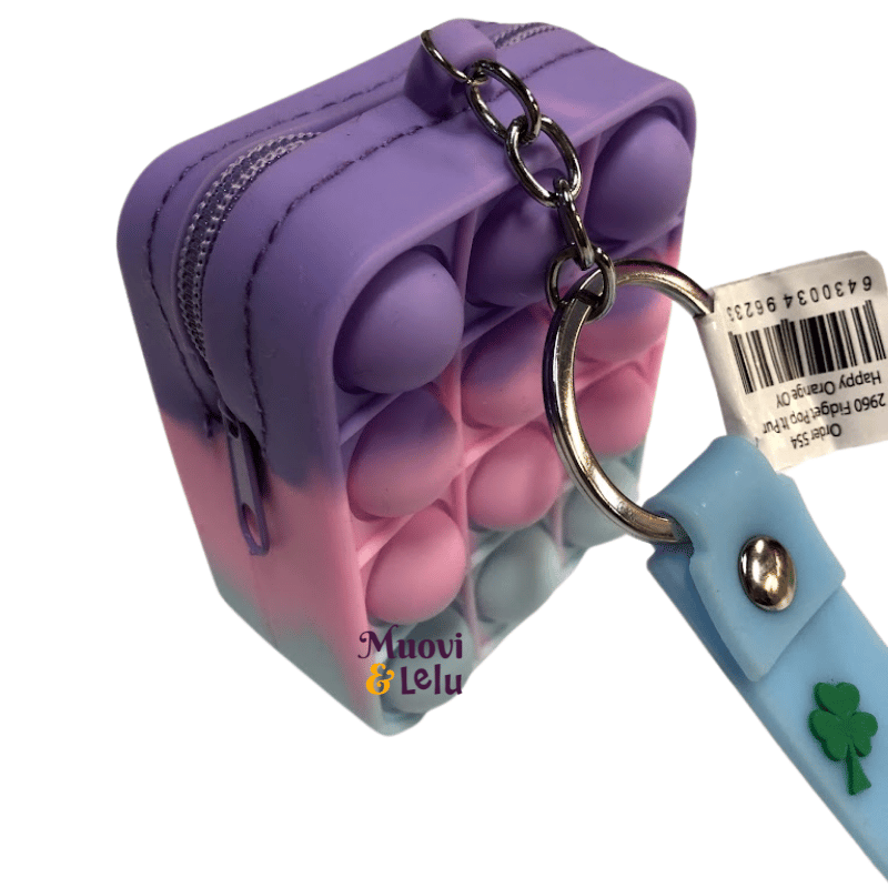 Hauska värikäs kukkaro, jossa on pop-it kuplia. Kukkarossa on vetoketju, ja avainrengas josta sen voi ripustaa. Kukkarossa voi säilyttää kaikenlaista pientä.