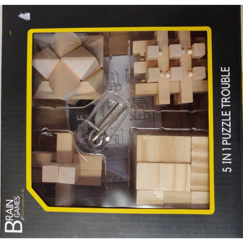 Pakkaus sisältää neljä puista ja yhden metallisen pulmapelin.