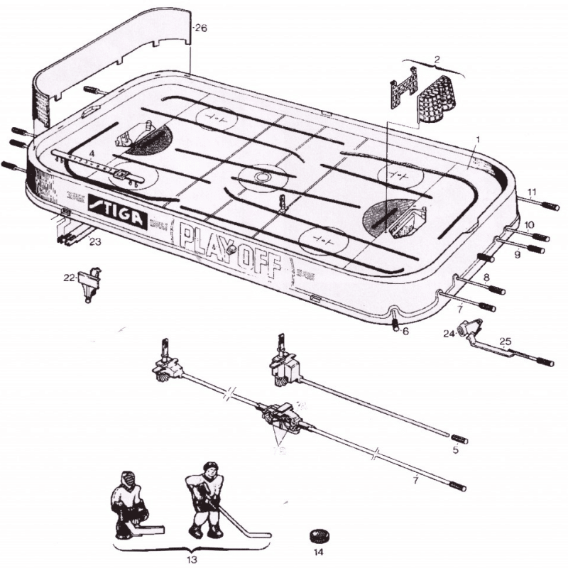 Alkuperäinen varaosa Stiga Play Off jääkiekkopeliin. Tangon kokonaispituus on 41 cm. Tanko on metallia. Tangon päässä on muovinen kiinnikeosa, joka tulee jalkapallopelin pohjan alle. Yläpuolelle siitä jää kiinnitysosa, johon laitetaan kiekkoilijahahmo.
