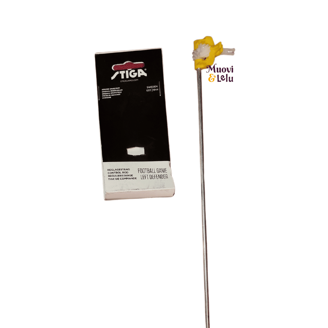 Stiga varaosa Jalkapallopelin ohjaustanko vasen puolustaja on Alkuperäinen varaosa Stiga Play Off jalkapallopeliin. Tangon kokonaispituus on 45 cm. Tanko on metallia. Tangon päässä on muovinen kiinnikeosa, joka tulee jalkapallopelin pohjan alle. Yläpuolelle siitä jää kiinnitysosa, johon laitetaan kiekkoilijahahmo.
