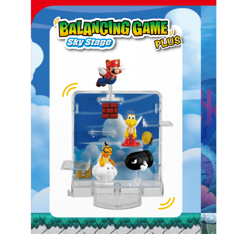 - Pakkaus sisältää neljä Super Mario-hahmoa, hyrrän ja tasapainottelualustan.