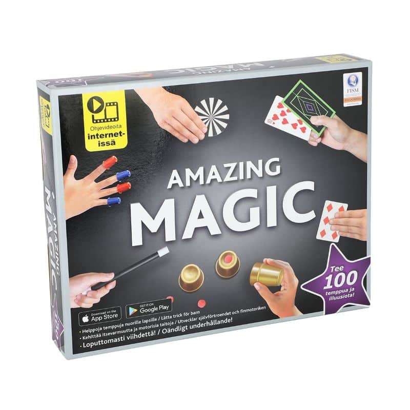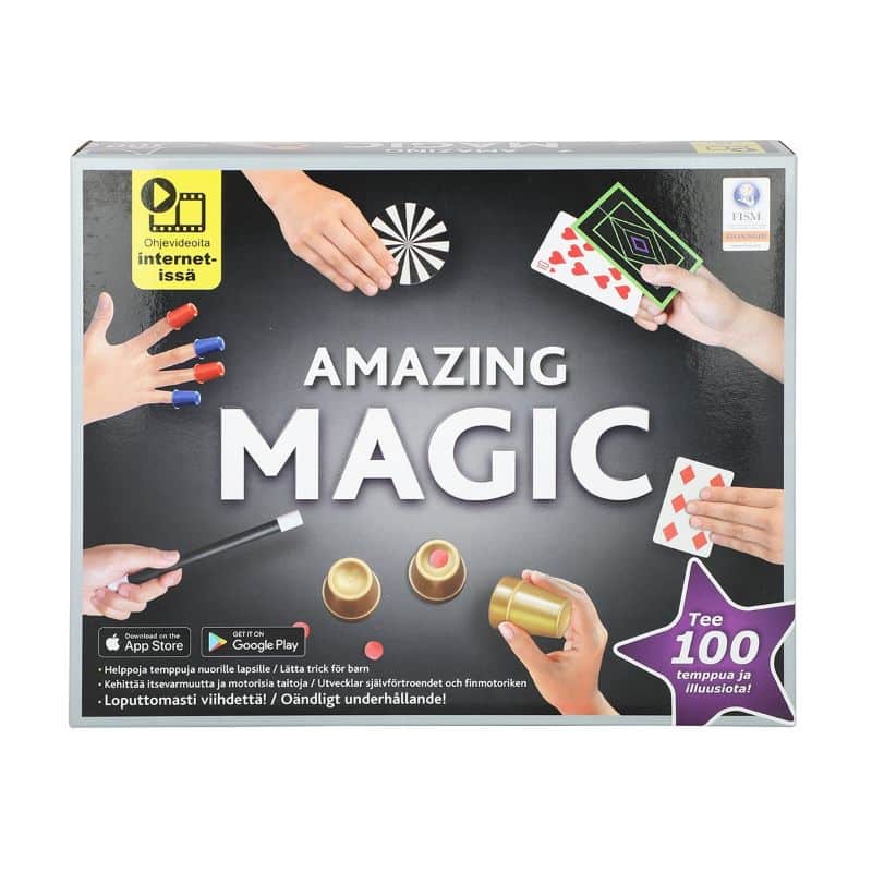 Mainio setti temppuja, jotka voi oppia nopeasti. Temppuina mm. erilaisia kortti- ja kolikkotemppuja sekä ajattomia temppuja kuppien ja pallojen kanssa. Setti sisältää ohjeet suomeksi ja ruotsiksi. Erilaisten taikatemppujen harjoittelu ja esittäminen kehittää itseluottamusta ja motorisia taitoja.