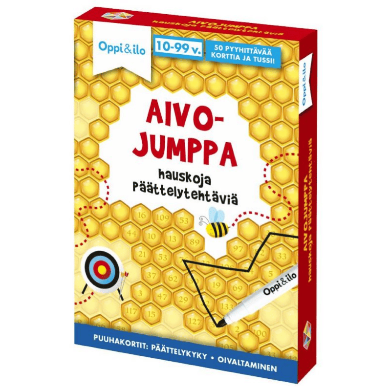 Oppi&ilo Aivojumppa -kortit tarjoavat mielenkiintoista ja sopivan haasteellista pohdittavaa koululaisille ja aikuisille. Näitä pulmia voi ratkoa koko suku! Kuka onkaan teidän perheenne mestari päättelytehtävissä? Kenen matikkapää raksuttaa parhaiten? Korteissa löytyy sanallisia pulmatehtäviä, paljon matikkatehtäviä sekä piirrospulmia. Tehtävät sopivat ratkottaviksi kotona ja reissussa. Päättelytehtäviä voi kokeilla myös koulun oppituntien lisätehtävinä. Tai kokeilkaa kisata ryhmissä kenen viisaat päät ratkaisevat tehtävän nopeimmin?