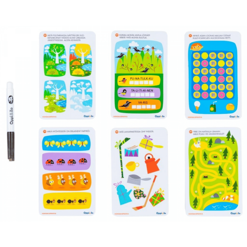 - Etsi, tutki ja oivalla! Monipuolisissa puuhakorteissa on innostavia tehtäviä, jotka kehittävät lapsen kynänkäyttötaitoa sekä vahvistavat päättely- ja keskittymiskykyä. Selvitetään reittejä, etsitään eroja, tunnistetaan samankaltaisuuksia ja paljon, paljon muuta. Oppi&ilon puuhakortit sopivat sekä yksin että yhdessä tehtäviksi.
