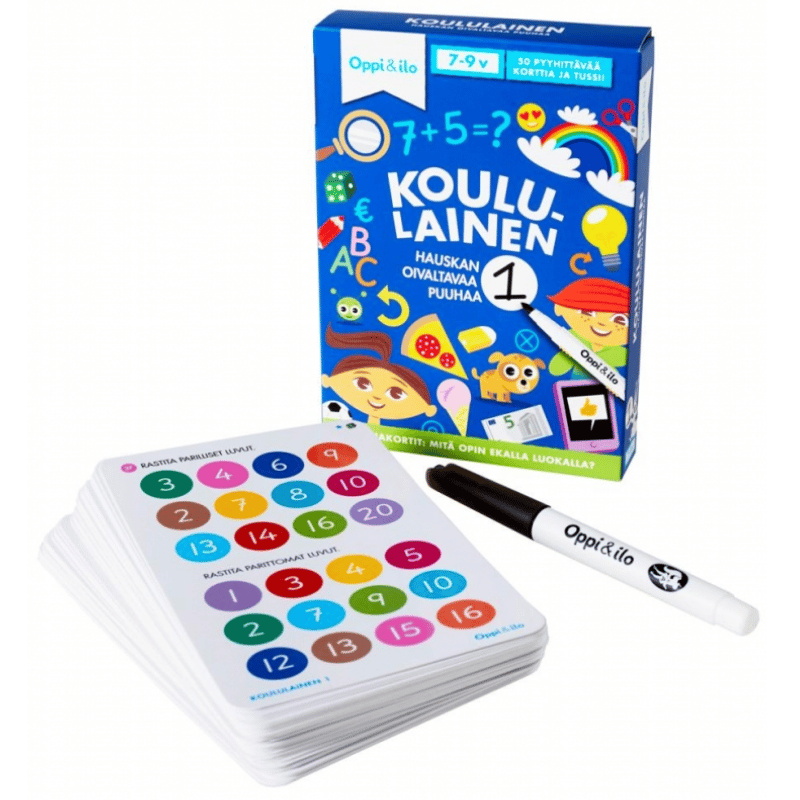 Mitä opin ekalla luokalla? Monipuolinen taitopaketti koulutiensä aloittaneelle lapselle! Numeroita, kirjaimia, päättelytehtäviä, omien taitojen arviointia… Oivaltava Oppi&ilon Koululainen 1 -tekemiskortit kehittävät koulussa opittavia taitoja. Ratko päättelytehtävät, taiteile numeropuuhat ja pistä parastasi sanatehtävissä. Lähes 100 oivaltavaa tehtävää, jotka tarjoavat rutkasti tekemisen ja onnistumisen iloa! Pakkaus sisältää poispyyhittävän tussin, jolla tehtävät voi tehdä uudelleen ja uudelleen!