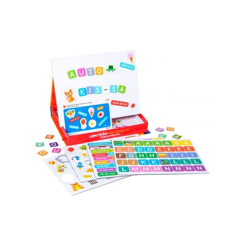Oppi&ilo Magneettipuuha Leikitään kirjaimilla on mainio puuhapakkaus lukemaan ja kirjoittamaan opettelevalle viskarille, eskarilaiselle tai koululaiselle!