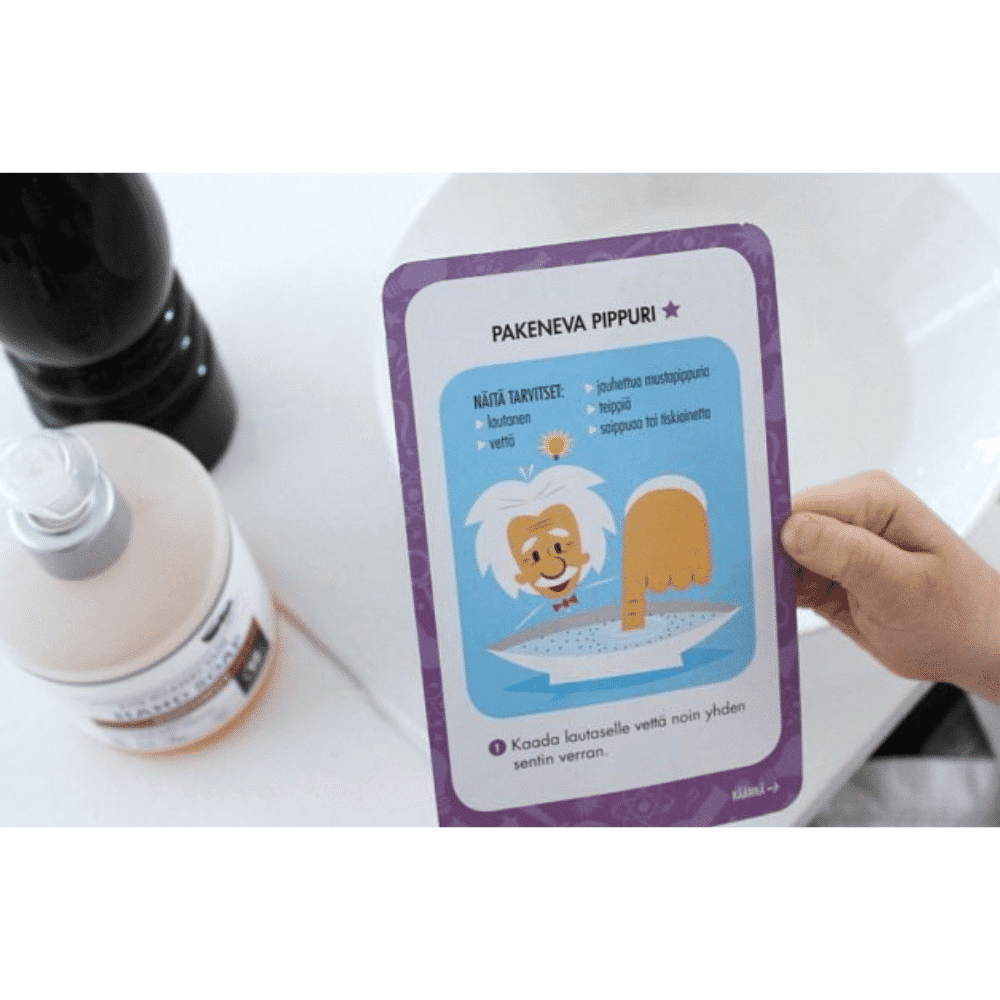 Opi kemiaa, fysiikkaa ja psykologiaa tekemällä ja kokeilemalla. Oppi&ilo Tiedetemppukorteissa on hauskoja ohjeita erilaisten tiedetemppujen tekemiseen sekä tieteelliset selitykset kunkin kokeen takana. Opi miten tehdään saippuakuplia itsestään puhaltava pullo, miten valmistetaan murtumatonta jäätä ja mitä tarkoittaa telepatia. Tässä korttipakassa riittää oivaltamisen iloa! Tehtävien suorittamiseen ei tarvita mitään ihmeellisiä aineita tai aparaatteja. Suurin osa tarvikkeista löytyy tavallisen kodin perusvarustuksesta ja keittiön tai kylpyhuoneen kaapista.