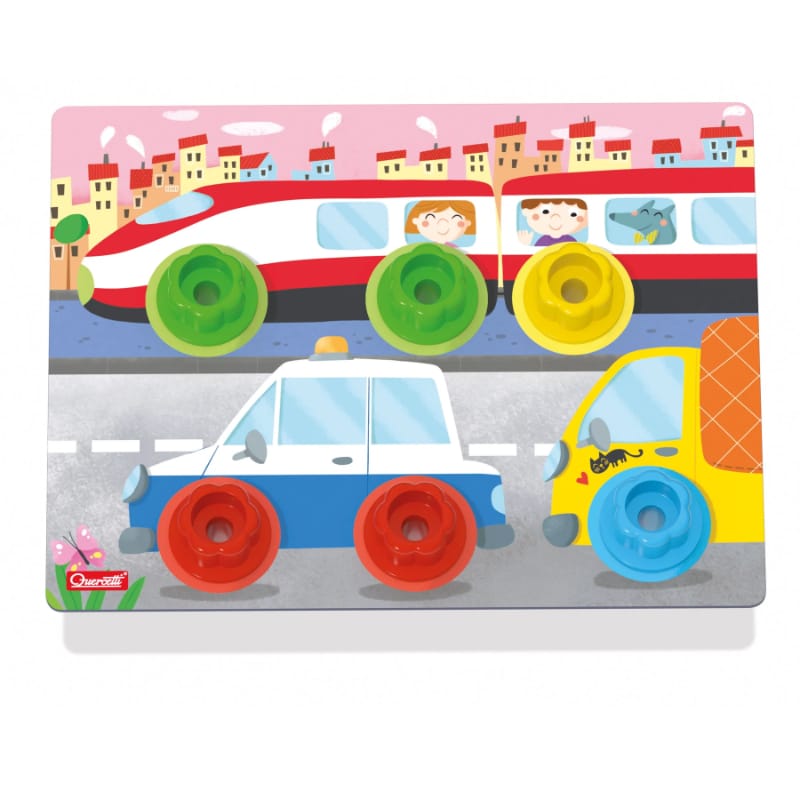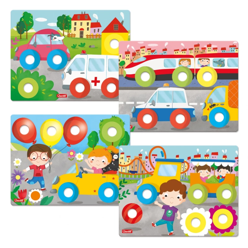 Suuret värilliset muoviruuvit ja pultit, jotka sopivat ja ruuvautuvat oikeaan paikkaan neljässä tukevassa pahvisessa kojelaudassa.