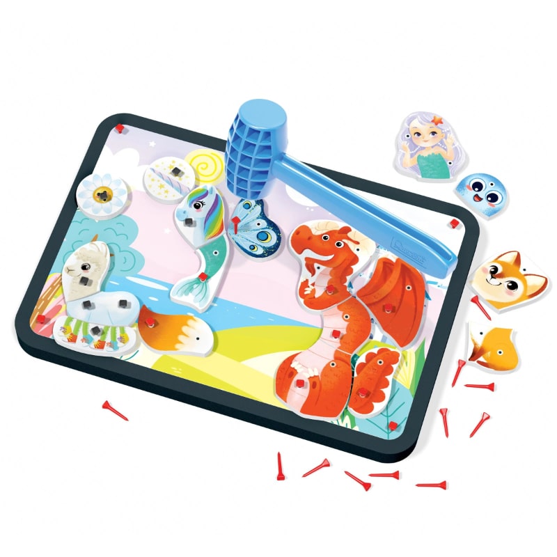 - Uudenlaiset materiaalit ja ainutlaatuinen muotoilu klassisessa naulalelussa. Lapsi voi vapaasti naulata hahmoja alustalle ja luoda loputtomia fantastisia tarinoita sekoittamalla ja sovittamalla muotoja.