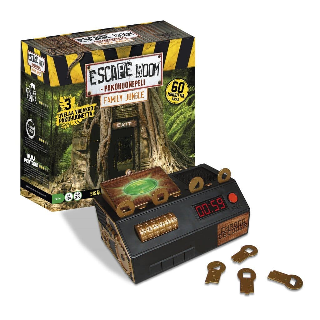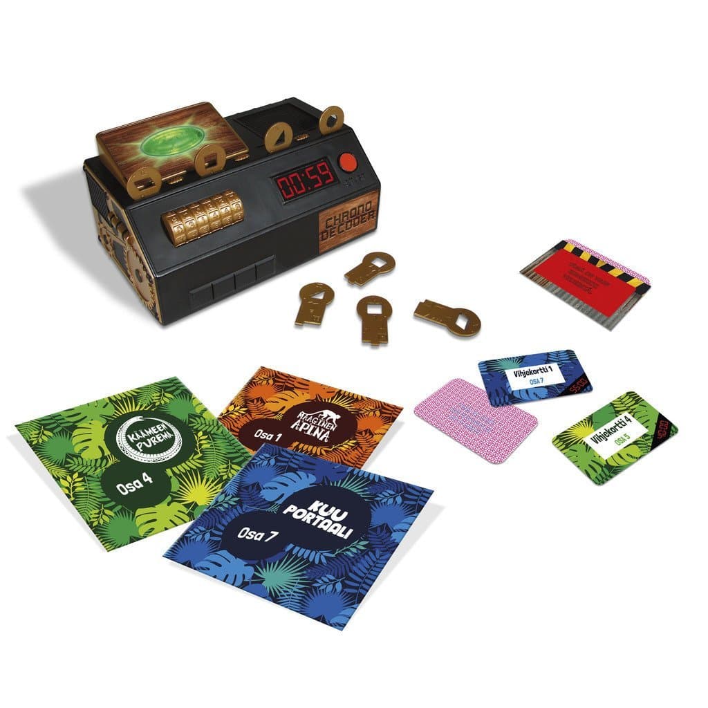 Pakkaus sisältää tehtävät ja vihjeet kolmeen jännittävään pakohuoneeseen, dekooderin ja pelisäännöt.