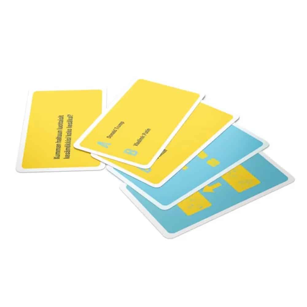 Kuka luo hulluimmat yhdistelmät? Yhdistele tunnettuja hahmoja ja hauskoja tilanteita pähkähulluin tavoin! Nosta hahmokortti ja tilannekortti. Valitse toinen hahmoista seuraksesi paljastamaasi tilanteeseen. Sitten muut pelaajat yrittävät arvata kreisin yhdistelmäsi. Jokainen oikein arvannut pelaaja saa pisteen. Eniten pisteitä kerännyt pelaaja voittaa!