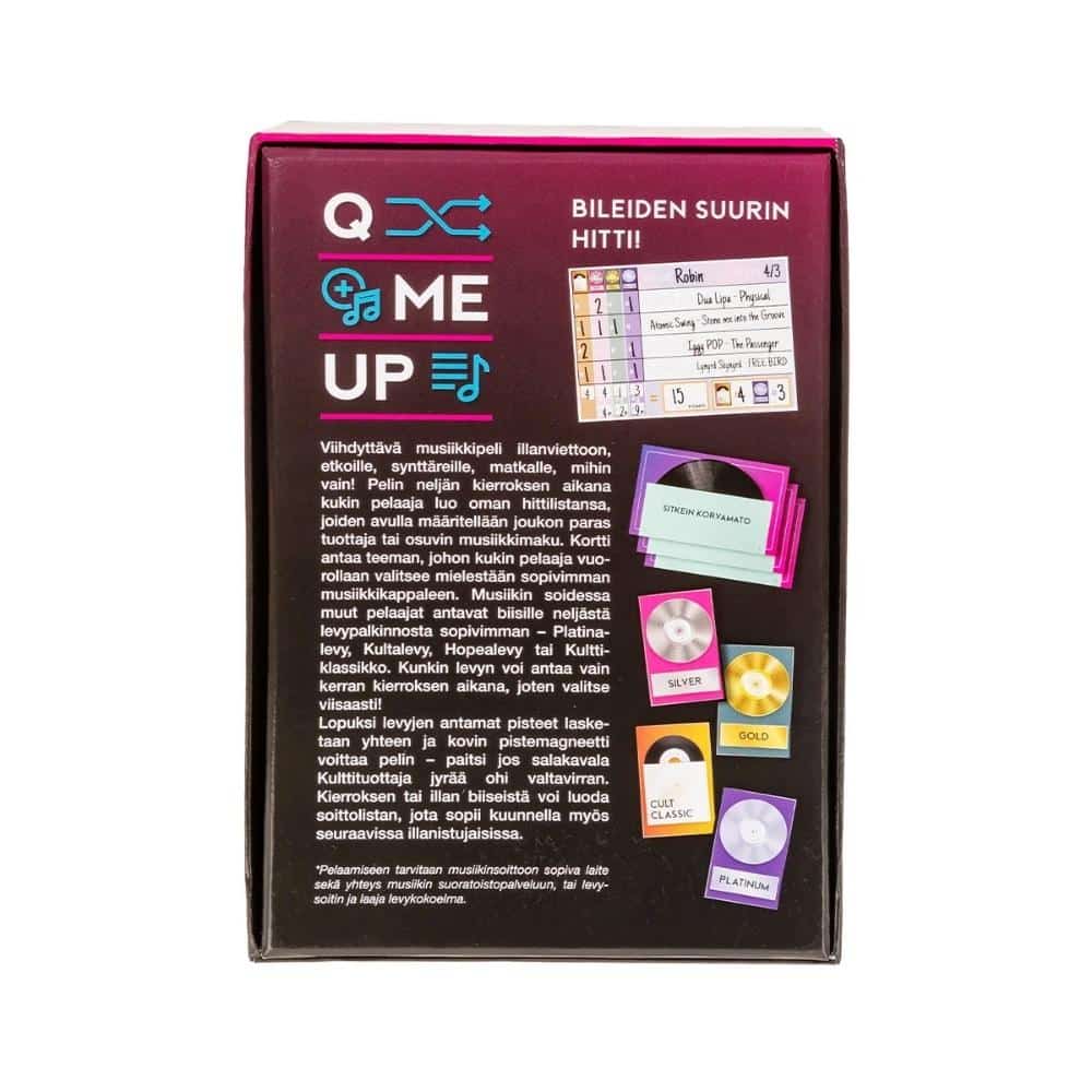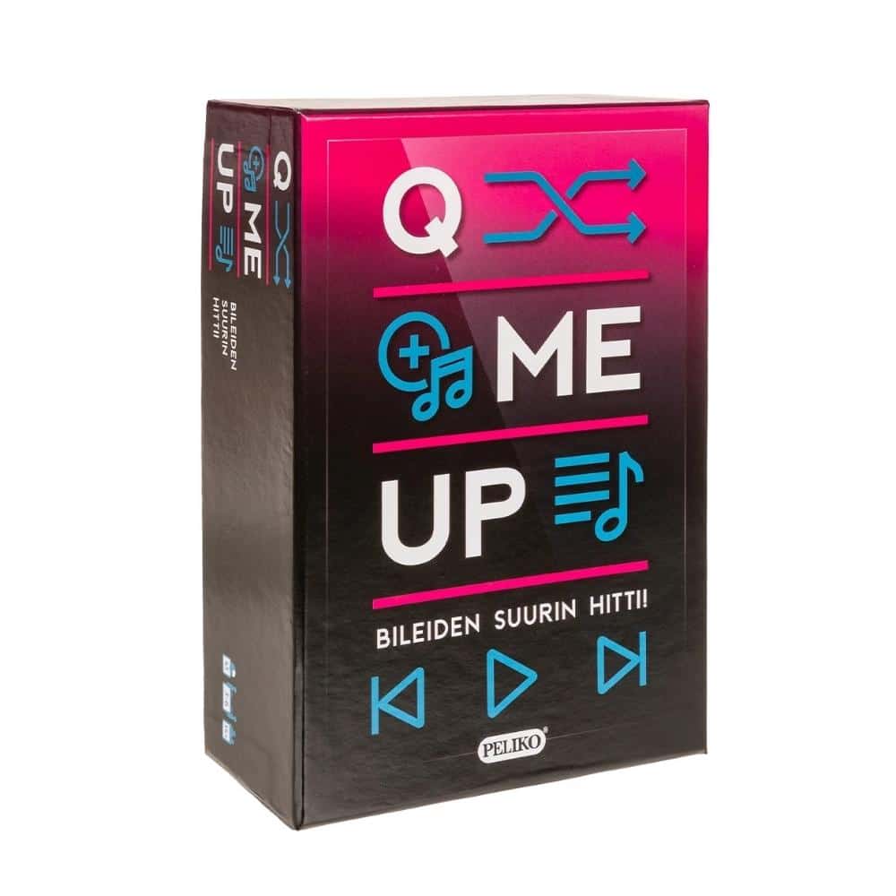 Q Me Up musiikkipeli Peliko on erittäin viihdyttävä musiikkipeli nuorille ja aikuisille, vaikka koko perheelle tai ystäville. Peliä pelataan 4 kierrosta, joiden aikana kukin pelaaja valitsee annetun aiheen mukaisen oman biisin ja soittaa sen vuorotellen. Jokaisen kierroksen kaikki biisit arvostellaan, ja pelin voittaa kovin pistemagneetti. Mainio peli illanviettoon, etkoille, synttäreille tai vaikka matkalle! 14+