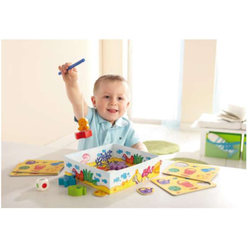 Värikäs ja hauska peli pienille kalastajille. Peliä voidaan pelata vapaasti, jolloin tavoitteena on kalastaa akvaariokaloja ja mereneläviä magneettiongella. Sääntöjen mukaan pelattaessa tarkoituksena on heittää noppaa ja kalastaa nopan värin mukaisia kaloja. Kaloissa on erilaisia lelujen kuvia, joita pelaaja kerää alustalleen. Voittaja on pelaaja, jonka pelilauta on ensimmäisenä täynnä. Pakkaus sisältää akvaariona toimivan pelilaatikon, magneettiongen, 6 ongittavaa kalaa, värinopan sekä peliohjeet. 1-4 pelaajaa. Paketin koko: 22x7x22 cm. Ikäsuositus: 2+.