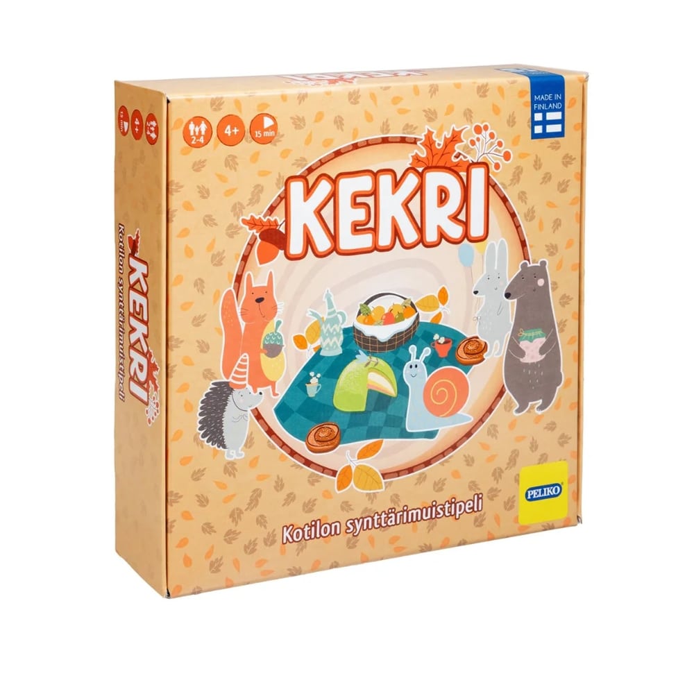 Kekri on hauska ja helppo peli, jossa yhdistyy muistipeli ja lautapeli uudella tavalla. Pelilaudalla pääsee etenemään, kun löytää samanvärisen tai samanmuotoisen kuvan kuin edelliselläkin askeleella. Haastetta ja mielenkiintoa peliin tuo yllättävä myrskytuuli, joka voi sekoittaa kaikki pelimerkit! Ensimmäisenä pelilaudan keskellä järjestettäviin kekkereihin saapunut pelaaja voittaa saa aloittaa kakun. Peliä voi pelata samanaikaisesti 2-4 pelaajaa, ja sen ikäsuositus on 4+. Peli sisältää säännöt suomeksi, ruotsiksi, norjaksi ja tanskaksi, ja pelin kesto on n. 15 min.