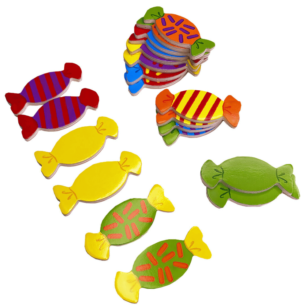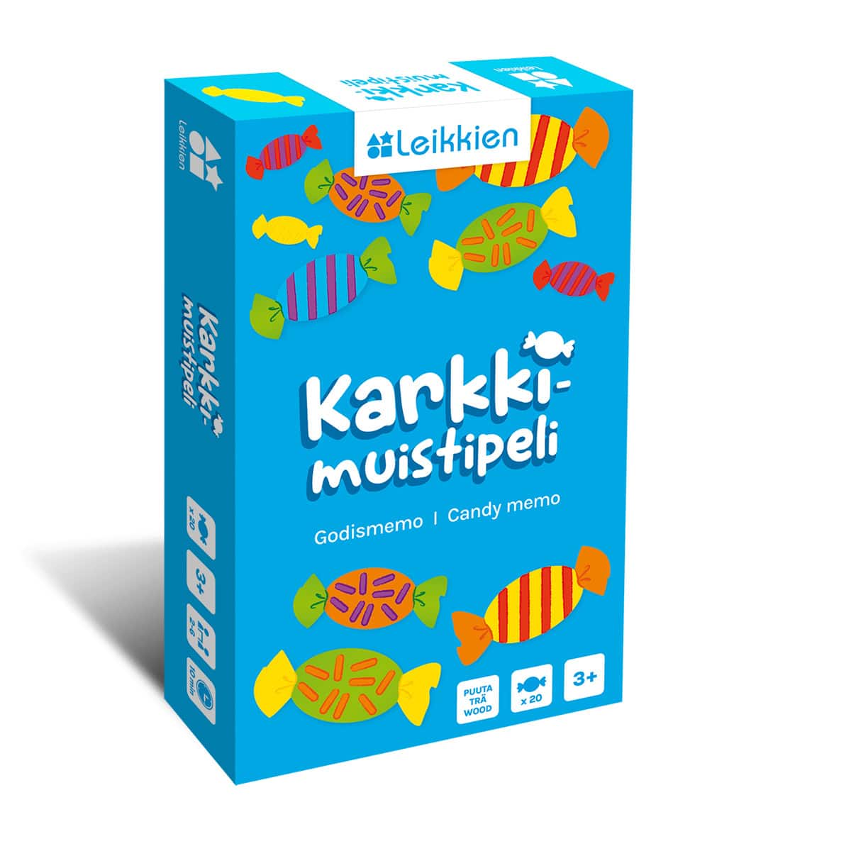 Leikkien Karkkimuistipeli on makea muistipeli, jossa etsitään samanlaisia karkkipareja! Muistipeli on hauska opettavainen peli, joka soveltuu koko perheelle ikään katsomatta! Pelissä on 20 muotoonleikattua puista karkkia eli yhteensä 10 paria.