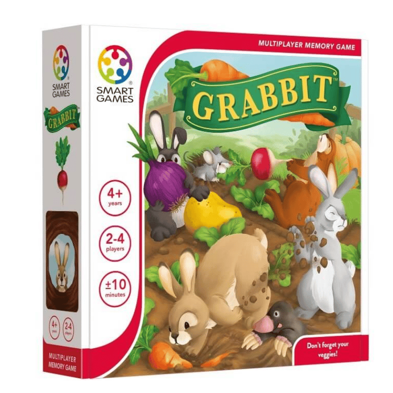 SmartGames Grabbit on lastenpeli, joka sopii myös koko perheen peliksi! Pelin pelaaminen kehittää monenlaisia tärkeitä taitoja. Pelaaminen vaatii keskittymiskykyä ja suunnitelmallisuutta, mutta kehittää myös muistia ja päättelykykyä. Myös ongelmanratkaisutaidot saavat harjoitusta pelin lomassa! Grabbit-pelin kaksi erilaista peliversiota takaavat, että kaikenikäisille pelaajille riittää sopivassa määrin haastetta. Hyppää mukaan hulvattomaan peliin!