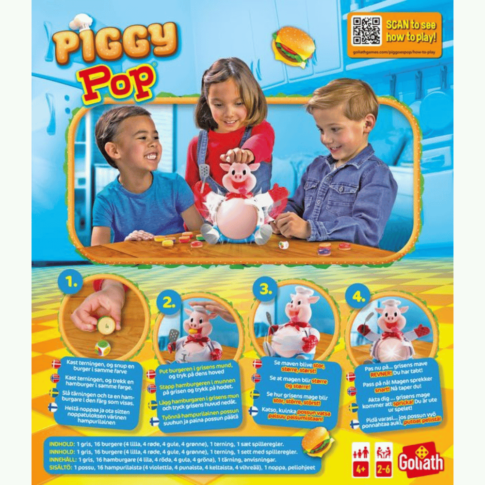 Piggy Pop -peli tarjoaa ratkiriemukkaita hetkiä lapsille. Pelaajat heittävät noppaa ja syöttävät possulle hampurilaisia. Possun maha kasvaa, mitä enemmän se syö – kunnes sen vyö pamahtaa auki! 2-6 pelaajalle. Ohjeet: suomi, ruotsi, norja, tanska. 4+