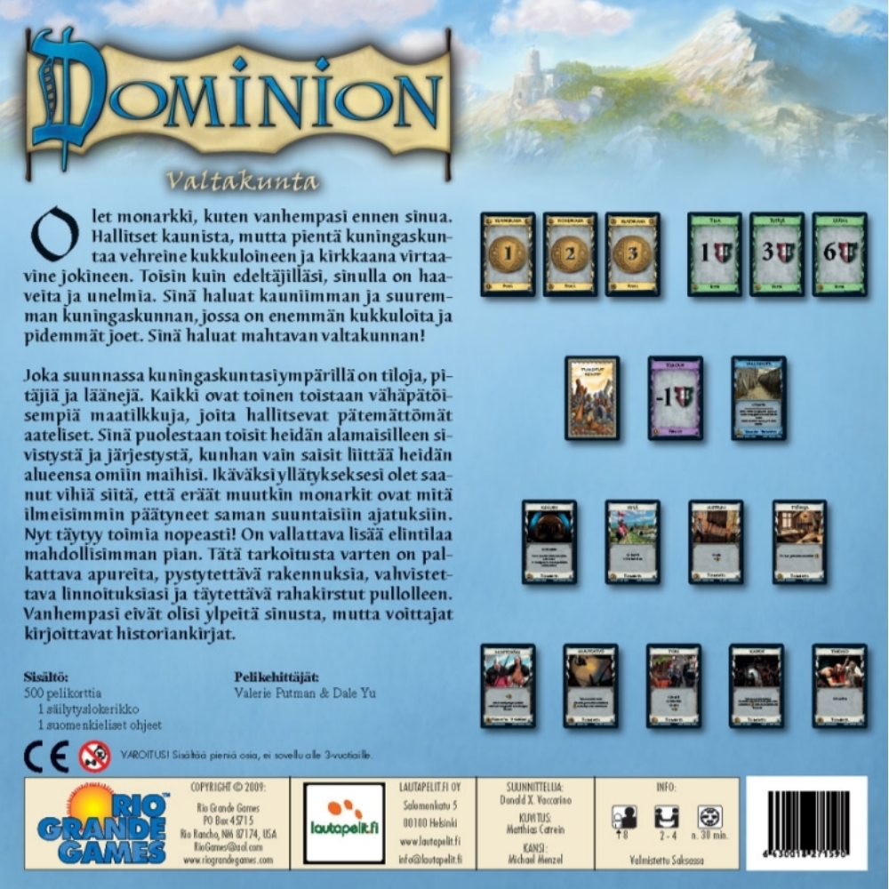- Pelin suositusikä on 8 vuodesta ylöspäin, ja se sopii mainiosti 2–4 pelaajalle. Kesto vaihtelee noin 30–45 minuutin välillä, joten Dominion tarjoaa sopivan pituisen elämyksen kiireettömiin iltoihin ja viikonlopun viettoihin.