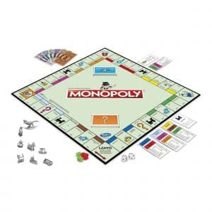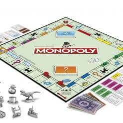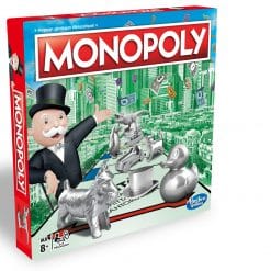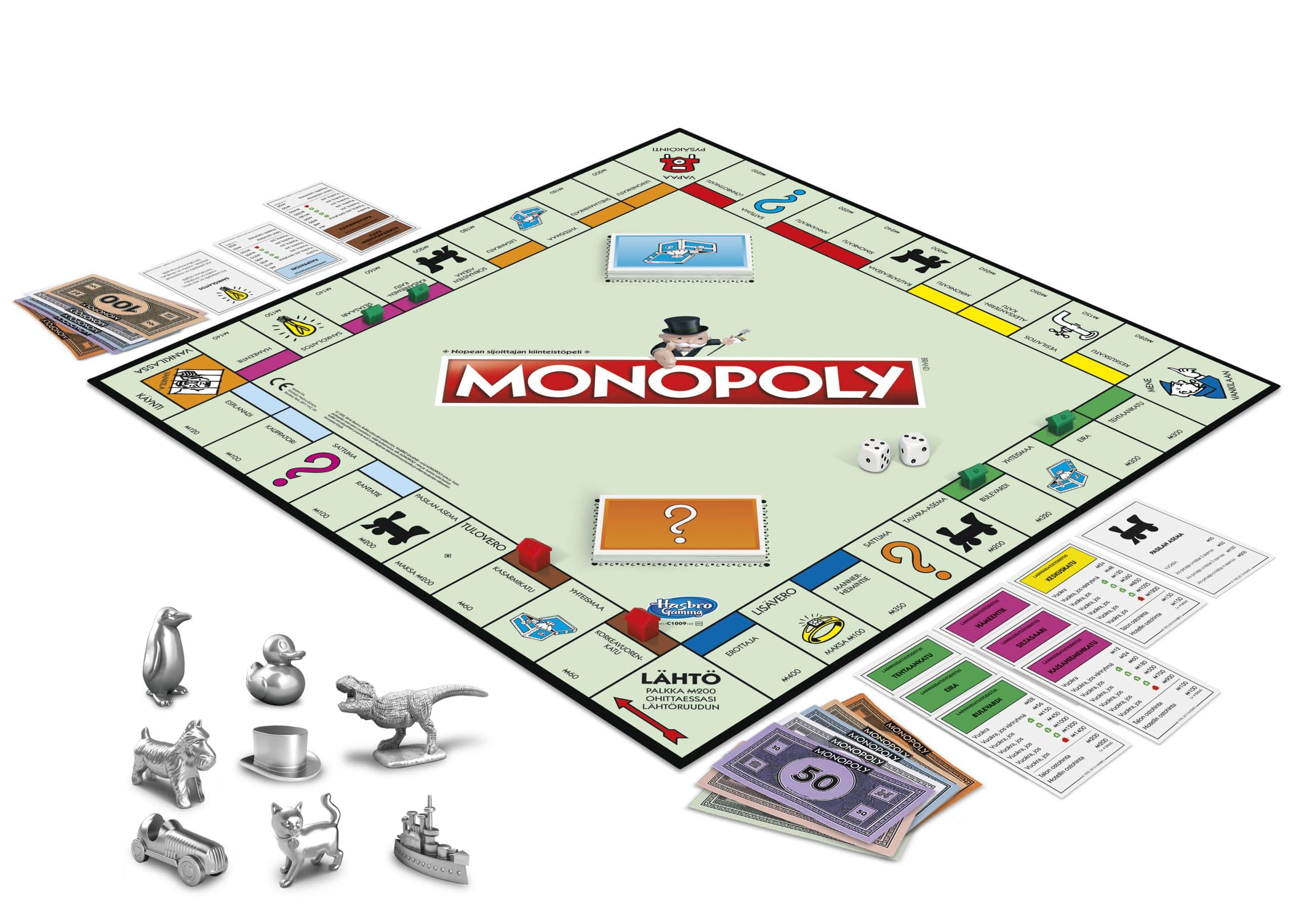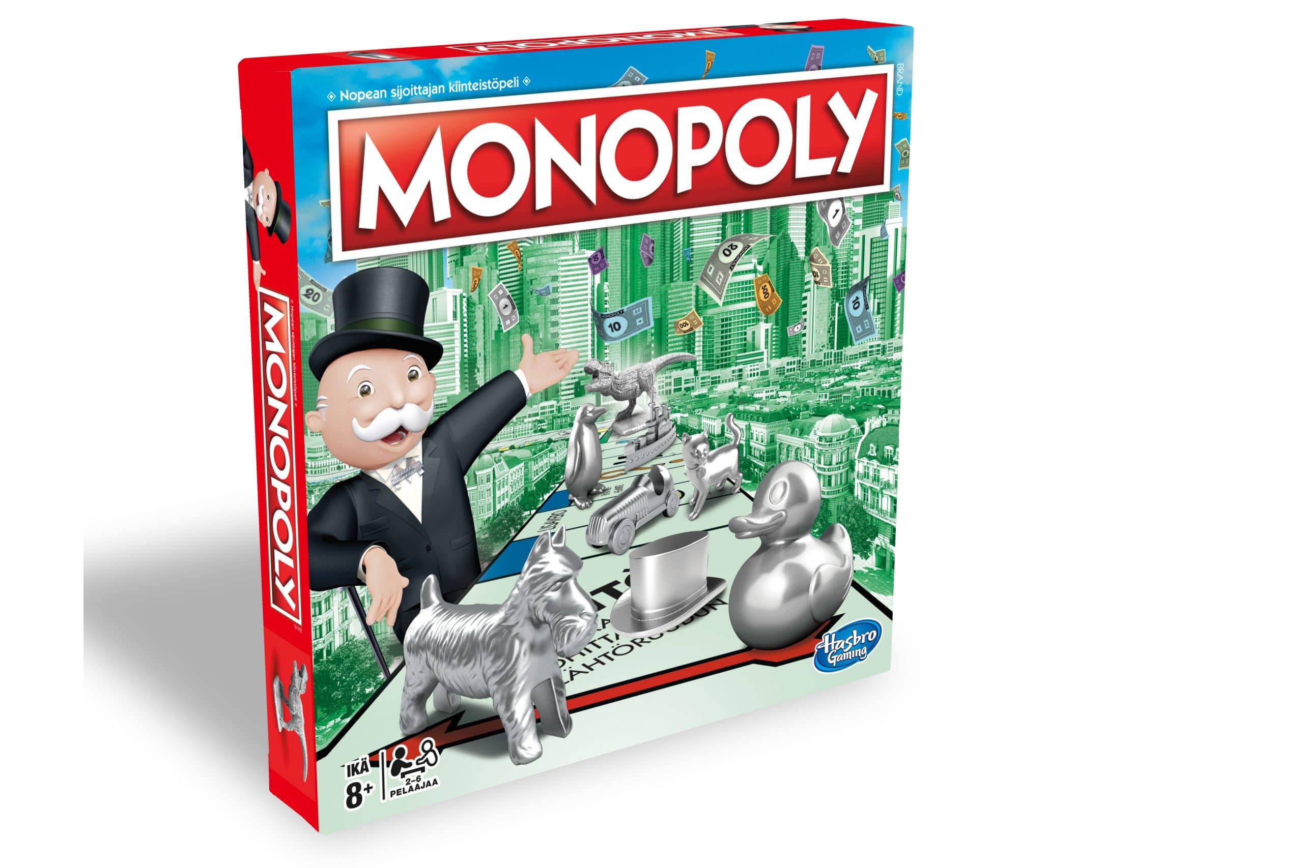 Klassinen Monopoly-peli uusilla pelinappuloilla. Tuttu neliön mallinen myyntipakkaus.