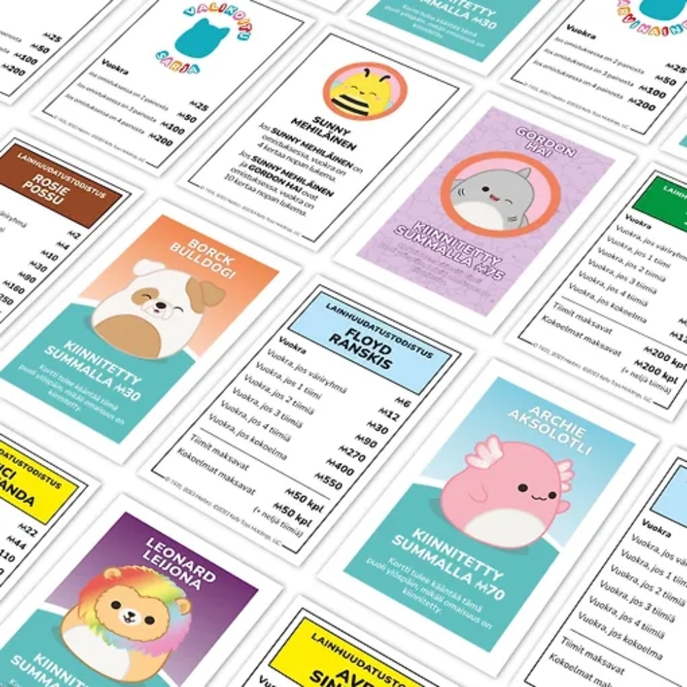Tuttu klassikkopeli Monopoly ihastuttavalla Squishmallows -twistillä! Tässä erikoisversiossa pelaajat ostavat, myyvät ja vaihtavat suosikki Squishmallows-hahmojaan. Tavallisten Monopoly-merkkien sijaan pelaat mukautetuilla Squishmallows -merkeillä. Näitä ovat Cam Silhouette, Feelin’ Mallow, kuulokkeet, Rainbow, aurinkolasit sekä Hang Tag.