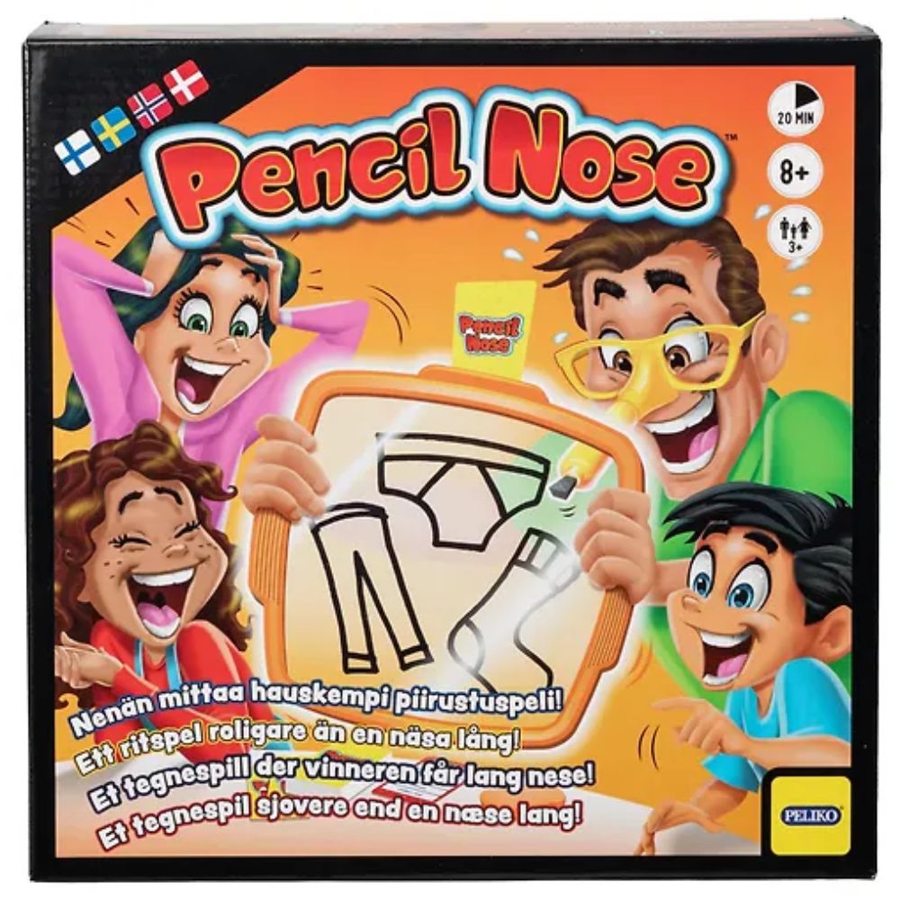 Laita erityiset lasit päähäsi ja ala piirtää kysymyskortista vuorotellen viittä esinettä tai asiaa. Muut pelaajat yrittävät arvata, mitä olet piirtämässä, ja oikeista arvauksista saavat pisteitä sekä sinä että arvaaja. Kuulostaa helpolta, eikö? mutta tehtävä ei olekaan niin yksinkertainen, sillä saat piirtää ainoastaan nenälläsi! Pencil Nose on hillittömän hulvaton koko perheen piirustuspeli, jossa nenää ei kannata nyrpistää!