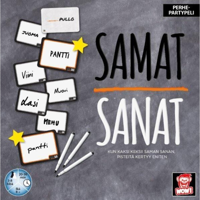 Samat sanat on mukaansatempaava, helppo ja nopeatempoinen koko perheen peli! Pelissä jokainen pelaaja keksii yhdyssanan puolikkaaseen toisen osan. Vuorossa oleva ja hänen kanssaan oikein arvanneet saavat pisteitä sen perusteella, kuinka moni muu on keksinyt saman yhdyssanan. Kun vain yksi pelaaja keksii saman sanan kuin vuorossa oleva pelaaja, pisteitä kertyy eniten! Varo, jos kukaan ei keksi kanssasi samaa sanaa, pisteitä ei kerry lainkaan.
