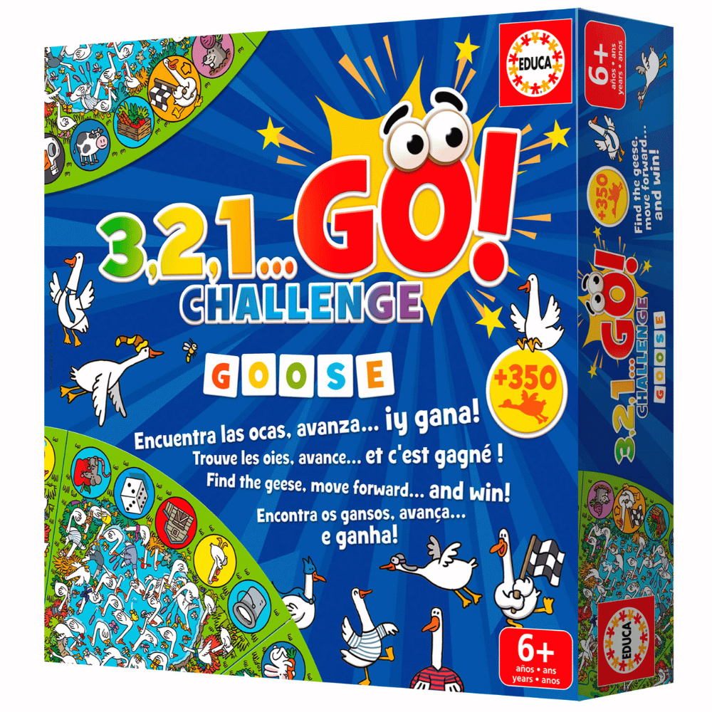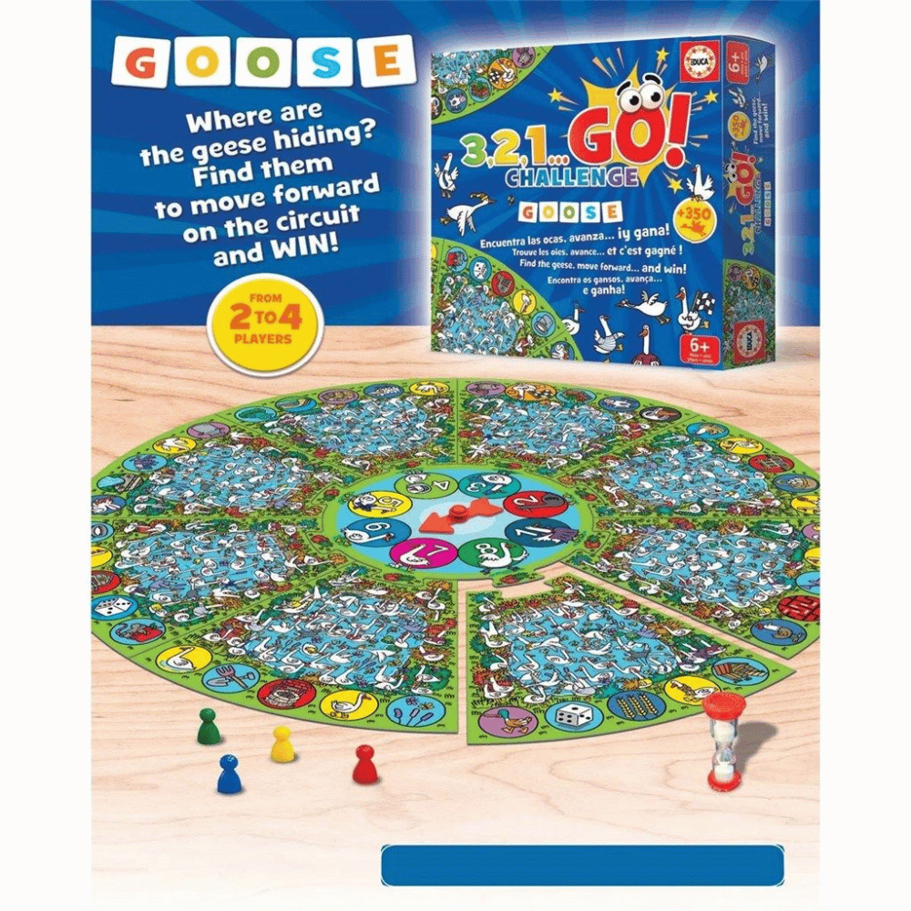 Missä hanhet piileskelee? Löydä oikea hanhi liikkuaksesi ympäri pelilautaa ja saavu maaliin ennen toisia pelaajia. 3,2,1 Go! Challenge Goose-peli soveltuu yli 6-vuotiaille lapsille. Pelissä on yli 350 hanhea.