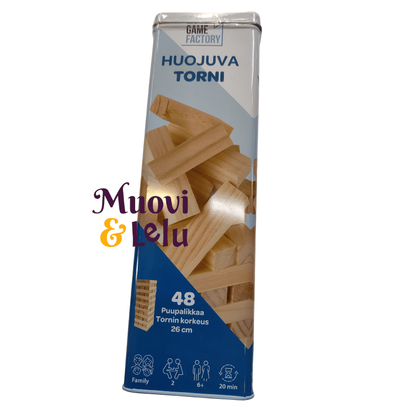 Huojuva torni on hauska ja jännittävä koko perheen klassikkopeli. Huojuva torni vaatii pelaajiltaan vakaata kättä ja kärsivällisyyttä. Poista palikka alemmista kerroksista ja siirrä se ylemmäs. Se, jonka vuorolla torni romahtaa, häviää pelin. Peli soveltuu kahdelle tai useammalle pelaajalle. Peli on kätevässä ja kestävässä peltirasiassa.