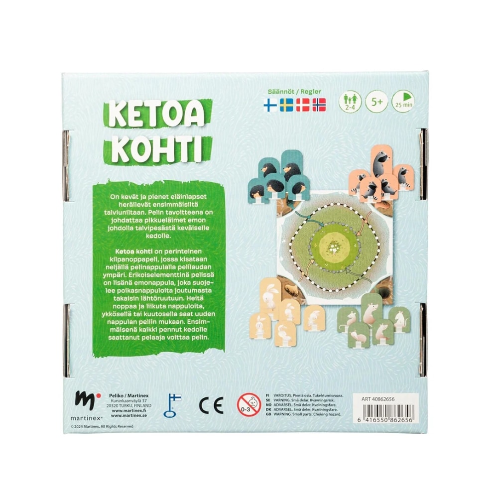 Iloinen ja perinteinen ludo-kilpanoppapeli, jossa kisataan neljällä pelinappulalla pelilaudan ympäri. Pelin tavoitteena on johdattaa nämä neljä omaa pikkueläintä talvipesästä keväiselle kedolle. Pelinappuloita liikutetaan nopan osoittaman silmäluvun verran eteenpäin, emon suojellessa vierellä. Peliä voi pelata samanaikaisesti 2-4 pelaajaa, ja sen ikäsuositus on 5+. Peli sisältää säännöt suomeksi, ruotsiksi, norjaksi ja tanskaksi. Pelin kesto on n. 25 min. Onnea matkaan!