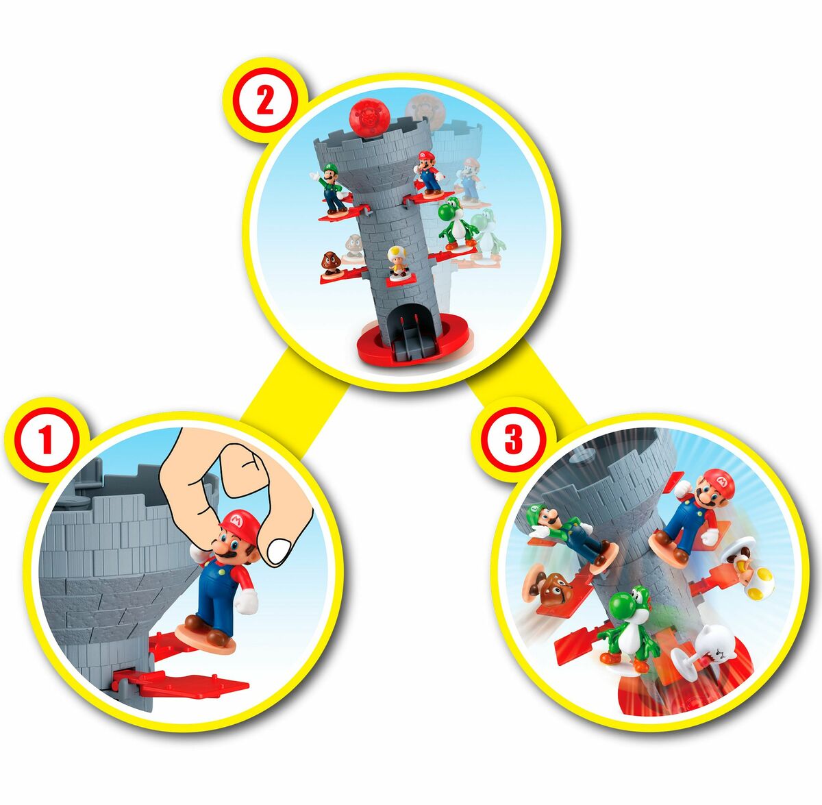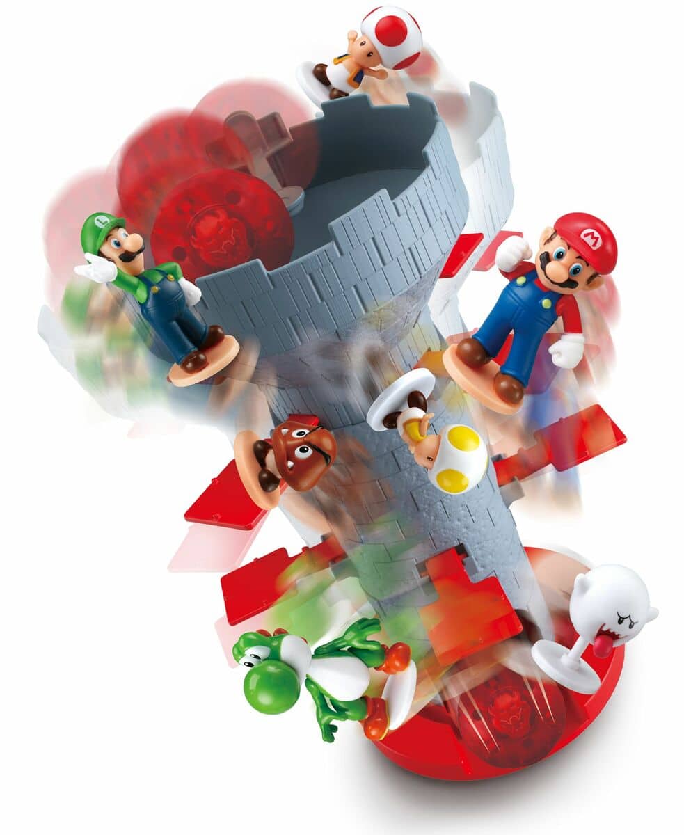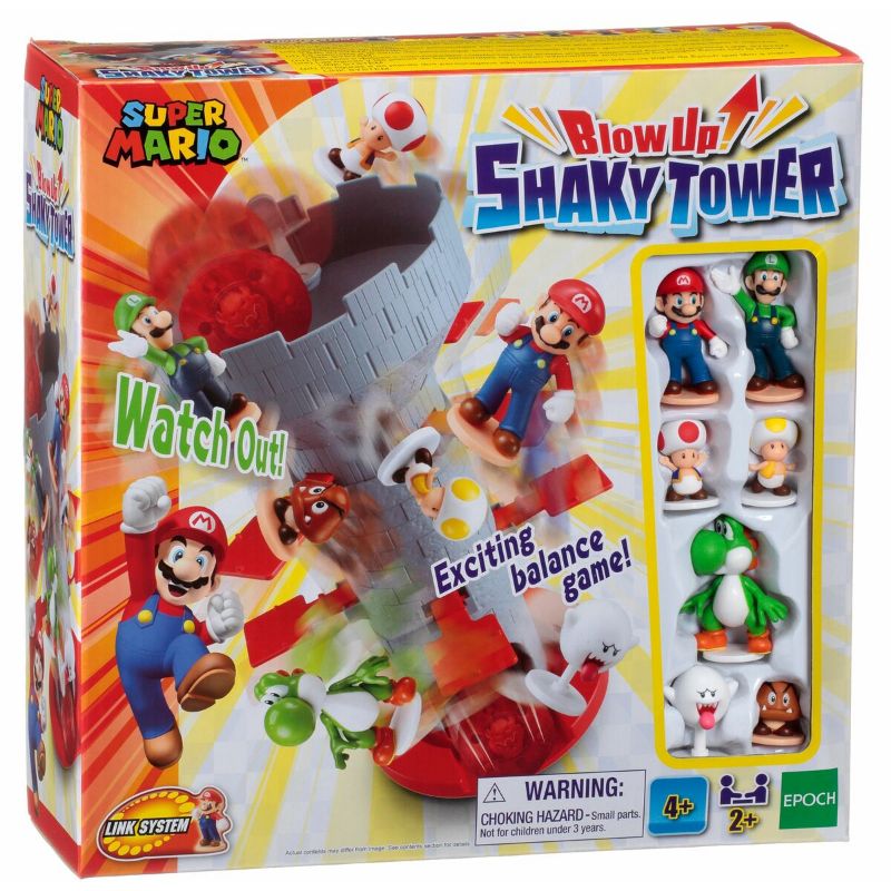 Super Mario™ Blow up Shaky Tower on hauska tasapainottelupeli kaikille paksuviiksisen putkimiehen ystäville. Pelissä Super Mario – figuurit asetetaan tornin reunoille vuorotellen. Ole varovainen, sillä Bowserin pallo on vaarassa pudota pahaa aavistamattomien hahmojen päälle. Pallon ja hahmot pudottanut pelaaja on poissa pelistä. Tasapainottelu vaatii vakaata kättä ja ehkä hieman onneakin, mutta kärsivällisyys lopulta palkitaan. Peli sisältää seitsemän kerättävää Super Mario -hahmoa, joita voidaan käyttää myös kaikissa muissa ”Link System” – tunnuksella merkityissä EPOCH Super Mario -peleissä.
