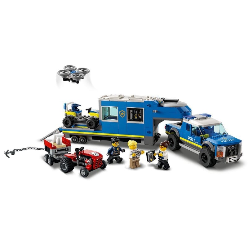 - Mitä pakkaus sisältää? – Kaiken tarvittavan poliisin lava-auton, vedettävän sellin, dronen, mönkijän ja perävaunullisen traktorin rakentamiseen sekä 4 minihahmoa, joista 3 tunnistat LEGO® City Adventures TV:stä