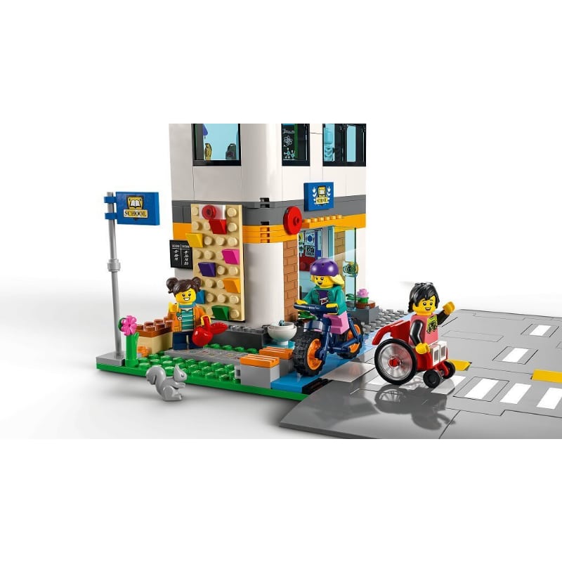 - Mitä pakkaus sisältää? – Kaiken tarvittavan 2-kerroksisen koulurakennuksen, koulun pihan, koulubussin, bussipysäkin ja polkupyörän rakentamiseen sekä 7 minihahmoa, mukana 2 LEGO® City TV:stä tuttua hahmoa sekä oravahahmo