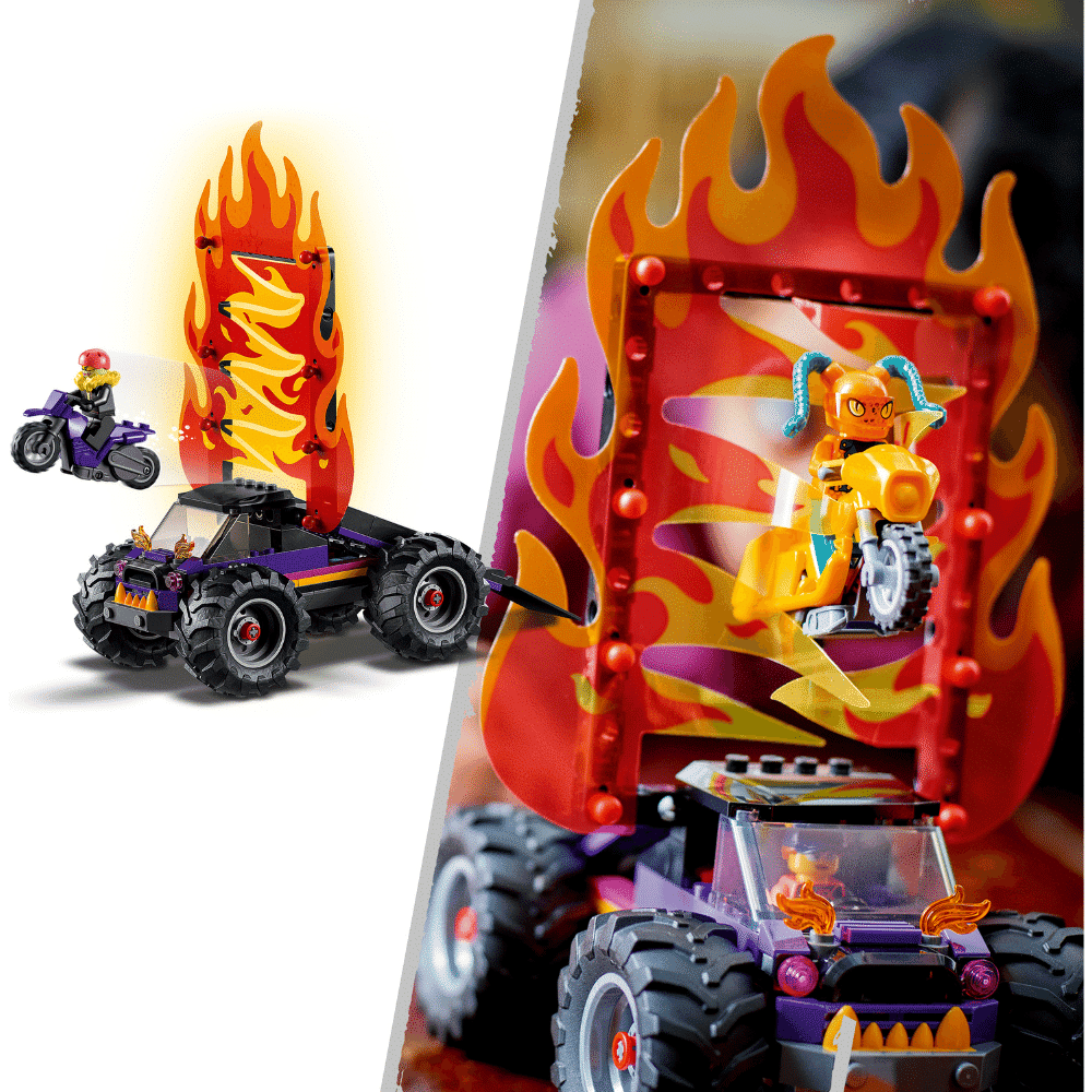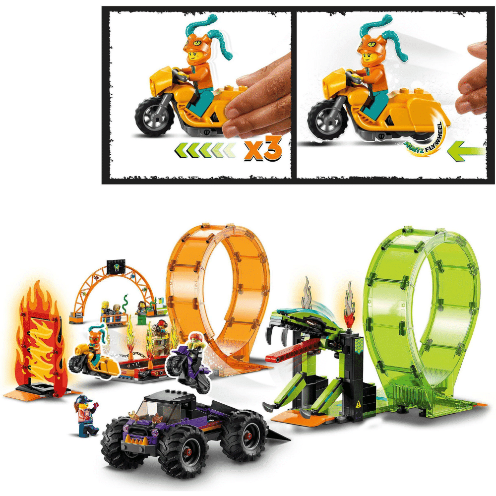 LEGO® City Kahden silmukan stunttishow’n areena (60339) leikkisetti sisältää paljon yksityiskohtia. Setti sisältää 2 vauhtipyörällä toimivaa stunttipyörää sekä rampilla varustetun monsteriauton huikeiden temppujen tekemiseen, liekkiseinän, käärmesilmukan, tulisilmukan ja monia muita tarvikkeita. Nappaa mukaan 7 minihahmoa, joista 2 on stunttikuljettajia, ja suuntaa jännittäviin esityksiin ja kilpailuihin.
