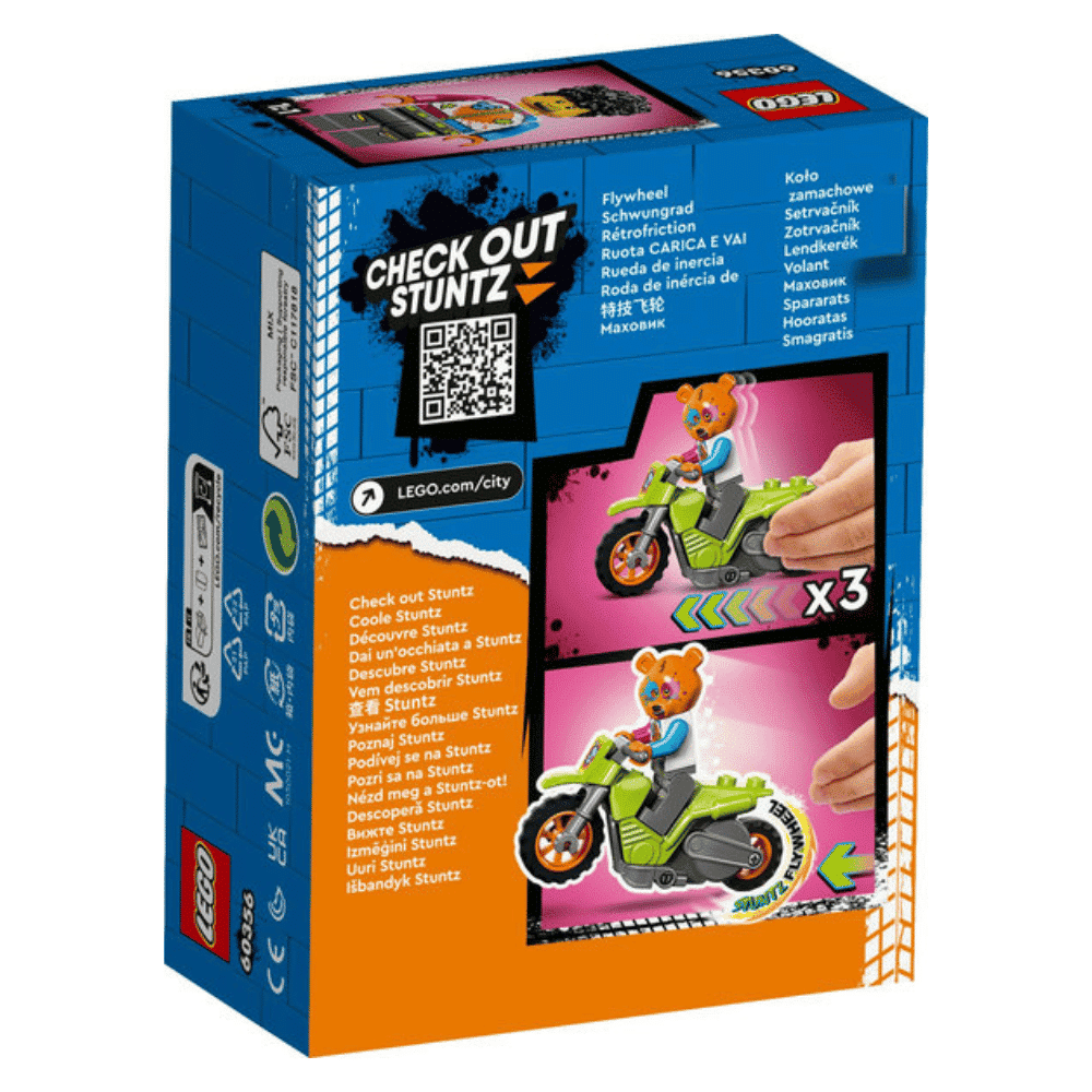 - Mitä pakkaus sisältää? – Setti sisältää stunttimoottoripyörän ja hauskan LEGO® City Stuntz kuljettajaminihahmon karhukypärineen