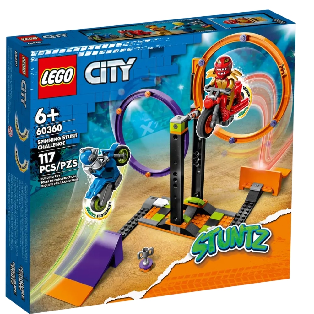Tämän LEGO City 60360 Pyörivä stunttihaaste setin parissa yli 6-vuotiaat lapset voivat järjestää jännittäviä esityksiä, pelejä ja kilpailuja. Mukana 2 pyörivää rengasta, 2 ramppia ja 2 vauhtipyörällä toimivaa stunttipyörää. Nappaa mukaan 2 LEGO City Stuntz kuljettajaa, niin moottoripyörähupailu voi alkaa.