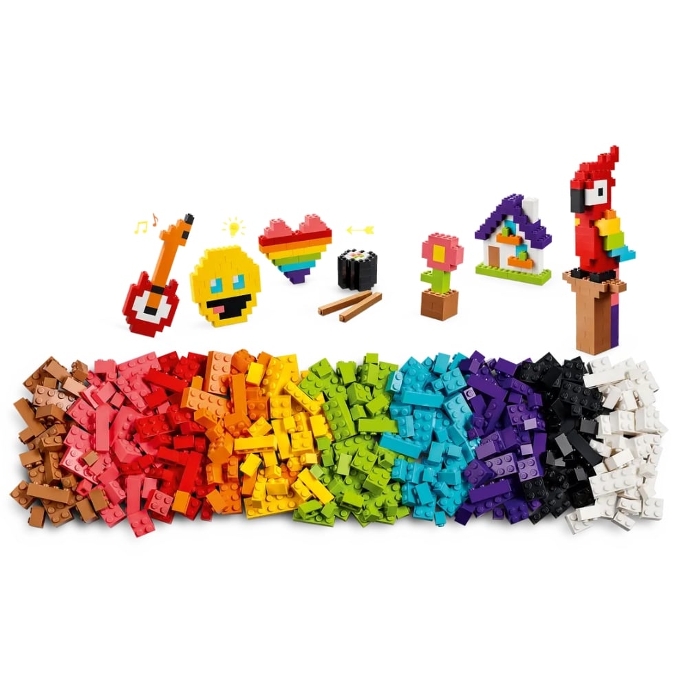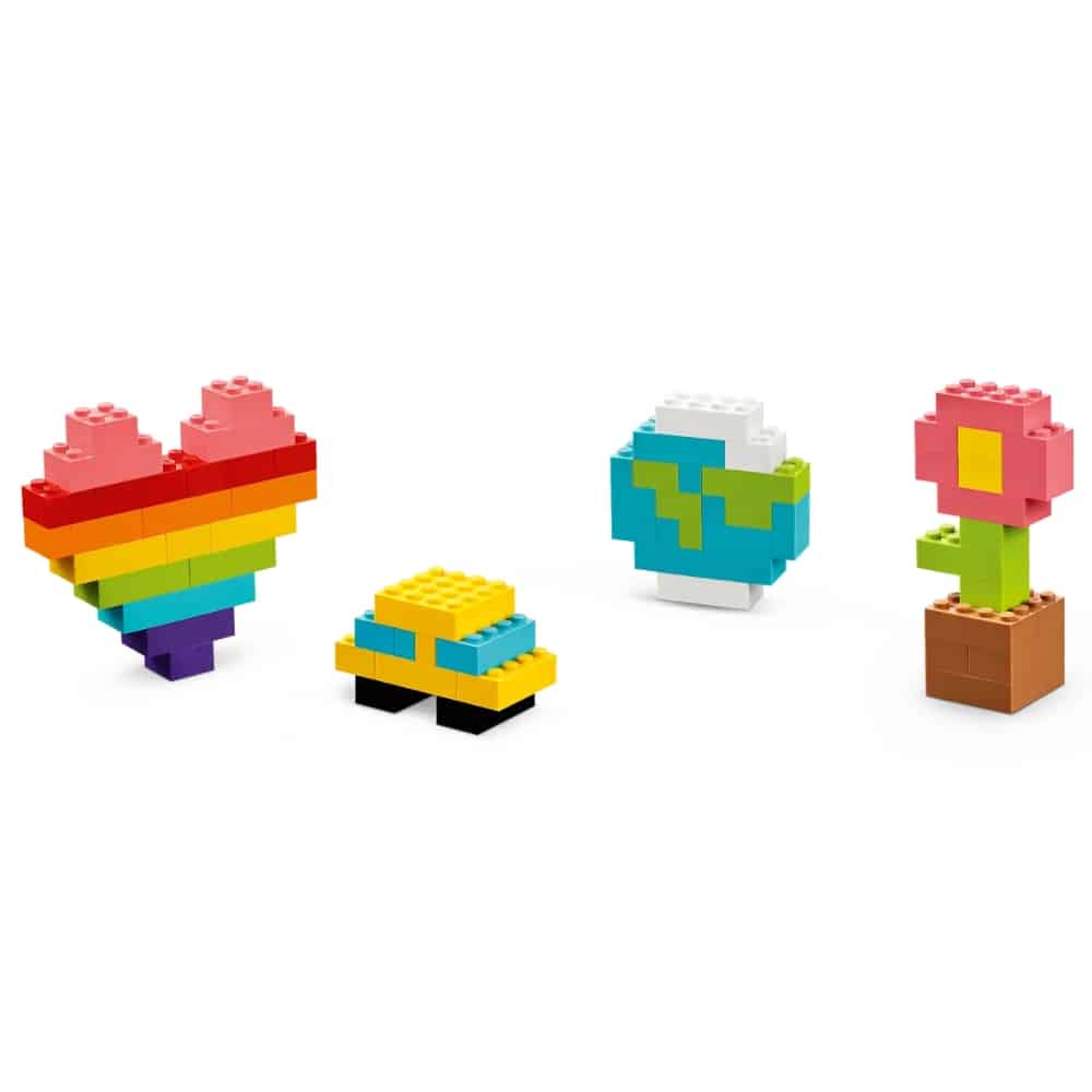 Setti sisältää valtavan määrän kirkkaanvärisiä LEGO palikoita – erityisesti alkuperäisiä ja supersuosittuja 2×4-koon palikoita! Setissä on selkeät ohjeet hauskojen mallien rakenteluun, mukana muun muassa auto, maapallo, kukka, sydän, kitara, talo, hymynaama-emoji, papukaija, koira ja omena. Setti innostaa vapaaseen, kekseliääseen leikkiin. Mukana on myös lehti, joka sisältää rakennusohjeet ja ehdotuksia nuorelle suunnittelijalle. Setin rakennusohjeet löytyvät digitaalisina LEGO Builder sovelluksesta.